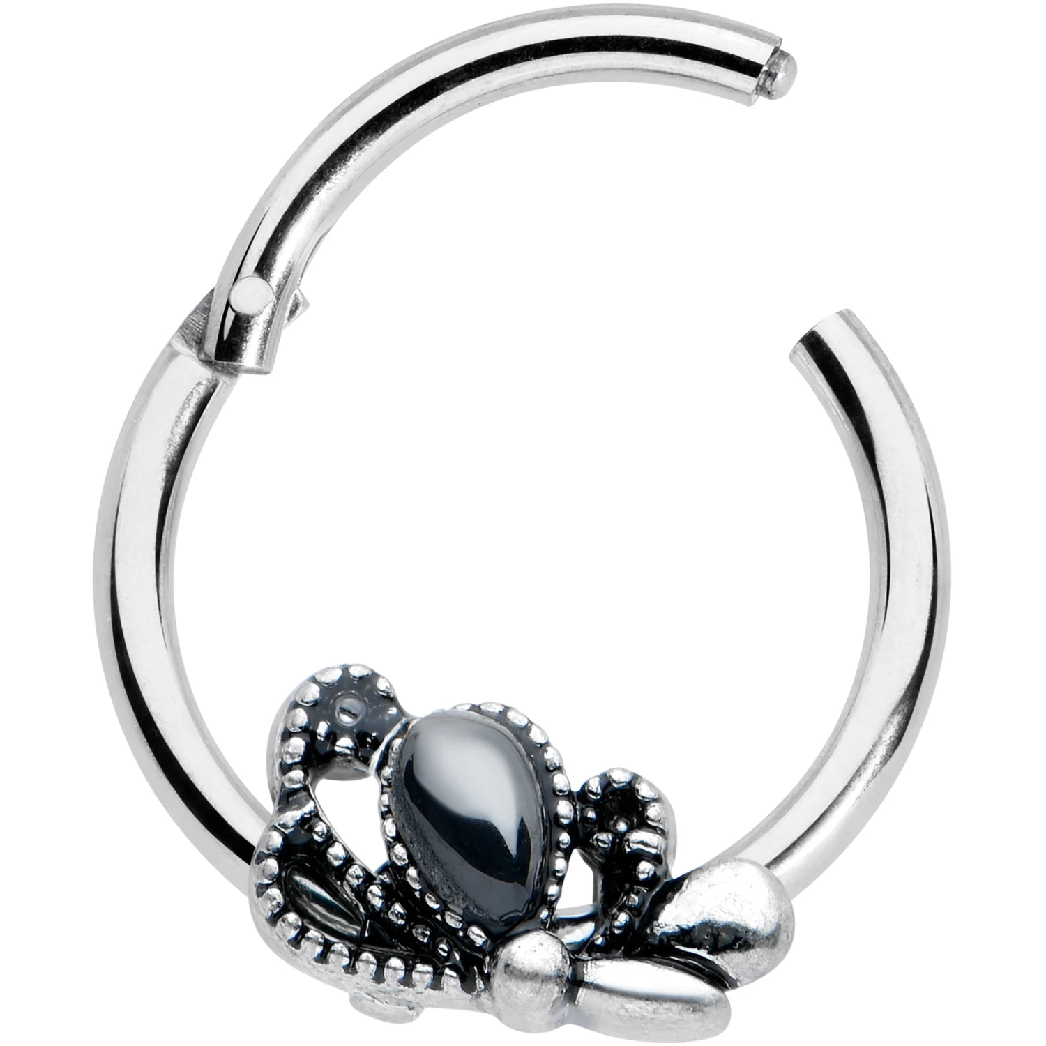 Get a little abstract with this 16 gauge septum ring! It’s made with a 10mm durable 316L surgical grade stainless steel straight hinged circular ring. It features a stylized bow charm, with smooth and textured loops for visual contrast. At the center, it’s set with a smooth black gem for an added touch of gothic style. It also features a hinged, non-removable segment that makes insertion and removal a snap. You can even boast this bow in multiple piercings including tragus, helix, and septum piercings. Wrap your look up with a bow with this elegantly abstract cartilage jewelry!