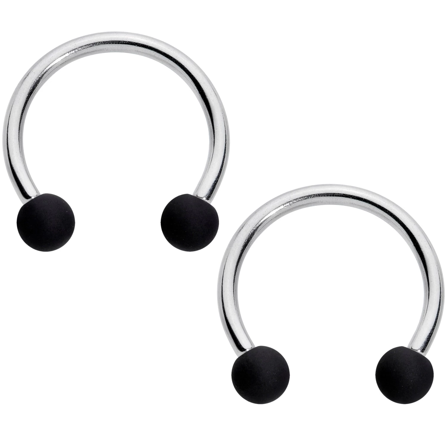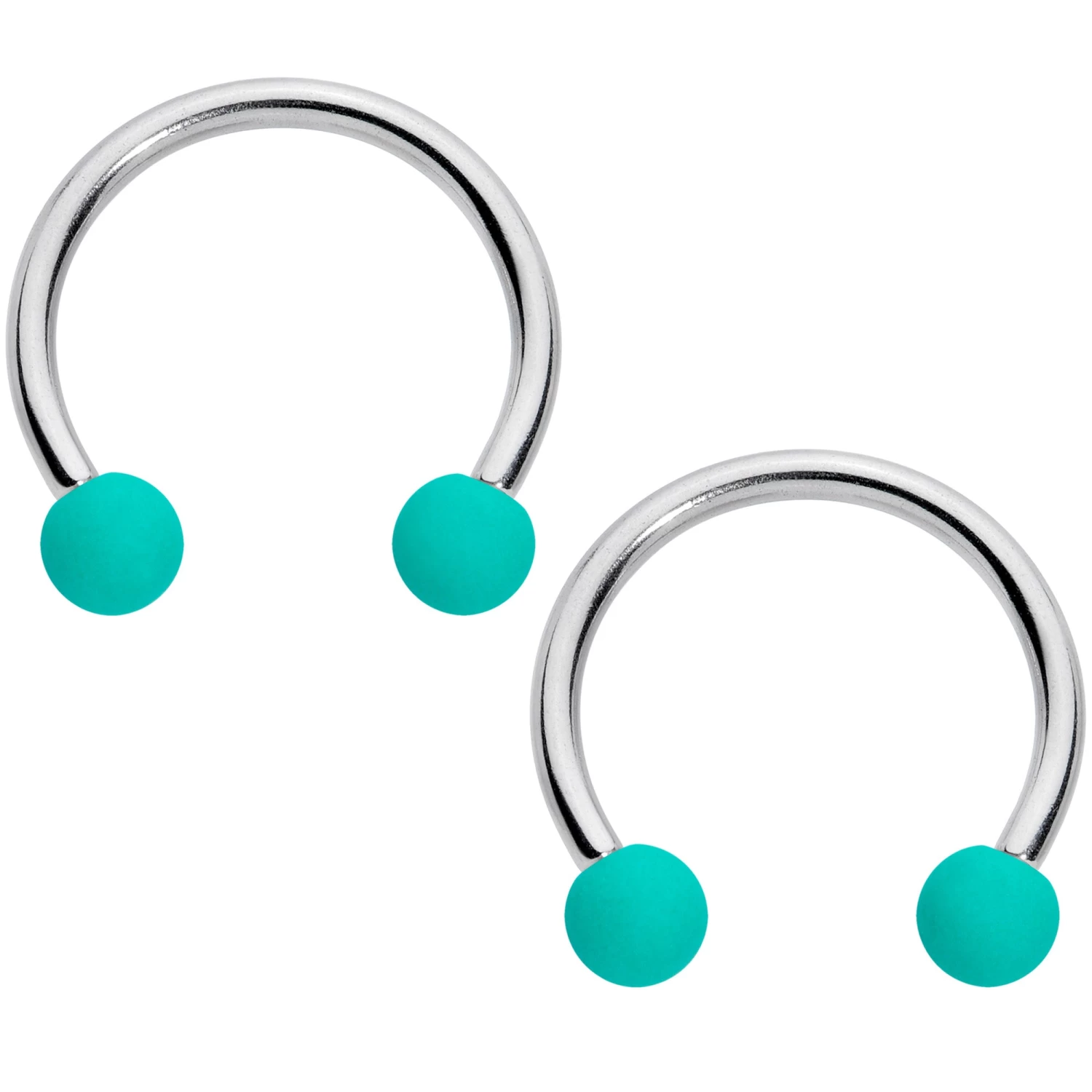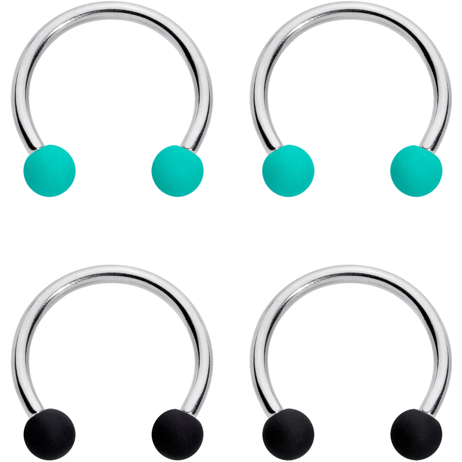 Whether you like your piercings to match or you’d rather mix it up a little, this set of 4 cartilage rings will keep you colorfully covered! They’re made with 10mm durable 316L surgical grade stainless steel circular barbells and have 3mm ball ends. The ball ends are matte with a subtly soft finish. You get one pair of horseshoe earrings with teal ball ends and one pair with black ball ends. This horseshoe jewelry works beautifully in multiple piercings including eyebrow and septum as well as cartilage piercings including the rook, daith, helix, tragus, and more. Mix or match….keep it matte! Sold as a set of four.