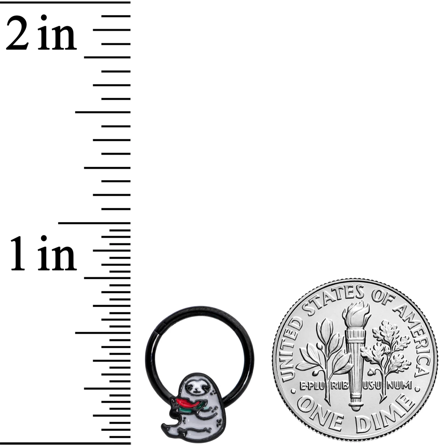They say sloth is a sin but the sloth on this 16 gauge cartilage ring is an absolute angel! It’s made with a 10mm black PVD over 316L surgical grade stainless steel hinged circular ring. It features a sloth charm, munching on a slice of watermelon! It also features a hinged, non-removable segment that makes insertion and removal a breeze and can be worn in multiple piercings including septum, helix, and tragus. Snap up this sloth while you can – it would be a sin to let it get away!