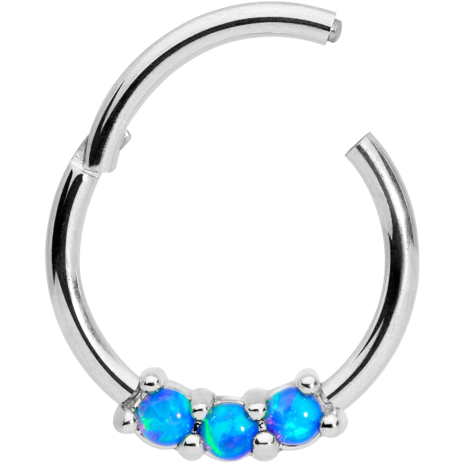 Now you can get the blues and love every minute of it with this 16 gauge cartilage ring! Made with a 10mm durable 316L surgical grade stainless steel hinged circular ring, it features a trio of stunning blue synthetic opals that subtly seem to shift color depending on what angle they’re viewed from. And thanks to its hinged segment design, this body jewelry ring is super easy to insert and remove with no parts to lose. And you’ll find that incredibly useful because it works well in a variety of piercings including tragus, helix, and septum. This little ring has some great big wonderful features in a scaled-down package!