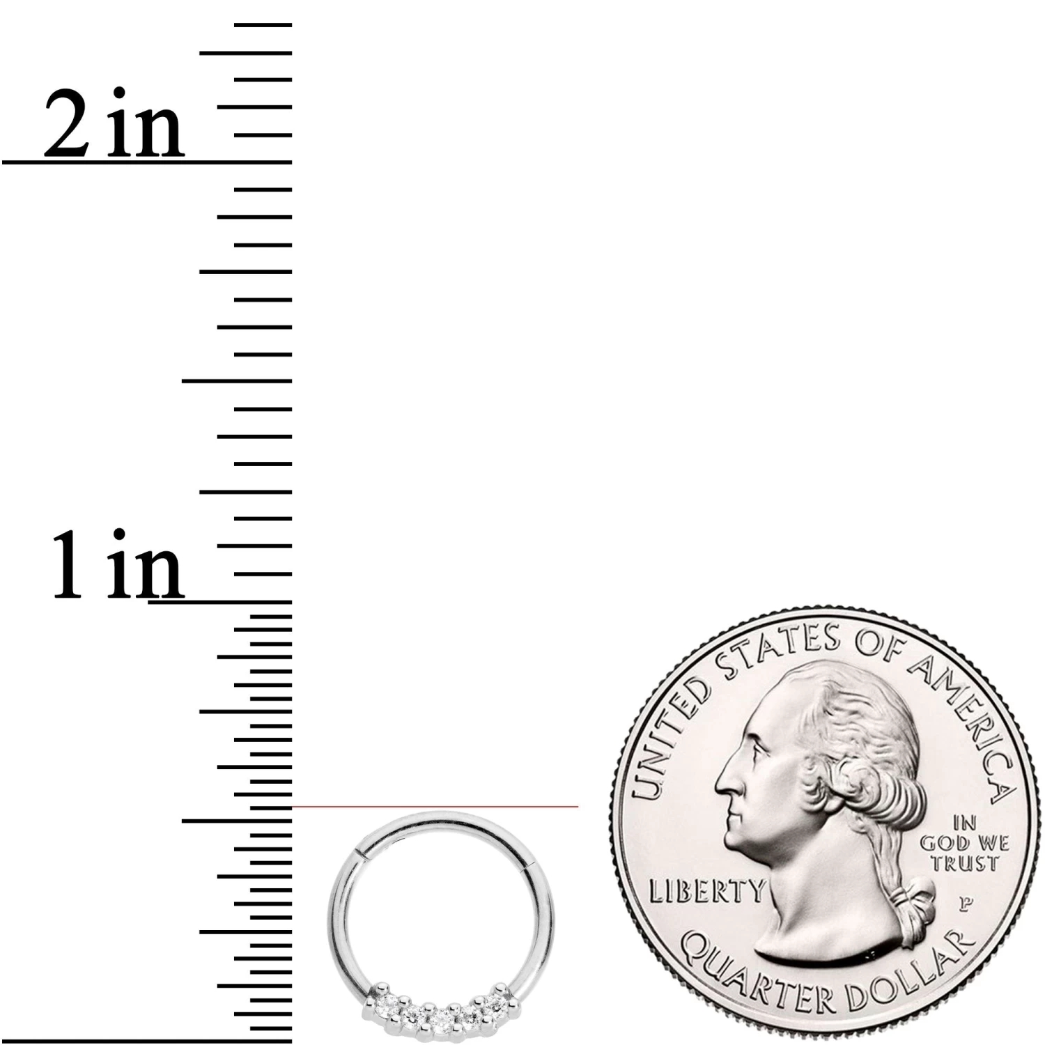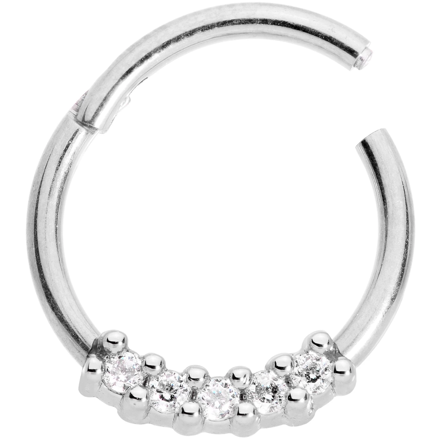This ring has it all: a classic shape, a bit of brilliance, and a brilliant design! This 14 gauge hinged segment jewelry is made with a 10mm durable 316L surgical grade stainless steel circular barbell. It’s highlighted by four clear cubic zirconia gems, small enough to be unobtrusive but offering a HUGE punch of panache! And best of all, it features a non-removable hinged segment that allows for incredibly easy insertion and removal. If you love the look of hoop jewelry in your piercings but don’t want to use a captive bead ring, this is your solution! This universal ring works wonderfully in multiple piercings including the septum, daith, tragus, helix, rook, and more making this feature one that you’re going to love!