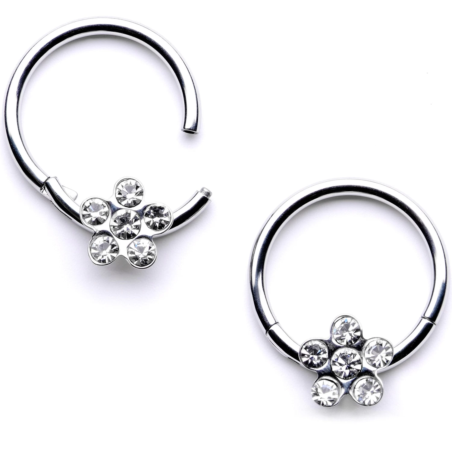 Exquisite design meets sophisticated taste on this striking segmented circular ring set. This pair of 16 gauge rings features a series of clear gems arranged in a four petal flower shape. The five gem flower design is mounted on the hinged segment of these circular rings, which are made with 10mm durable 316L surgical grade stainless steel. These rings feature a hinged, non-removable segment for easy insertion and removal from your piercing. Grab this pair of universal rings to be worn in the cartilage, nipples, or whatever piercing is a perfect fit for you. Sold as a set of two for you!