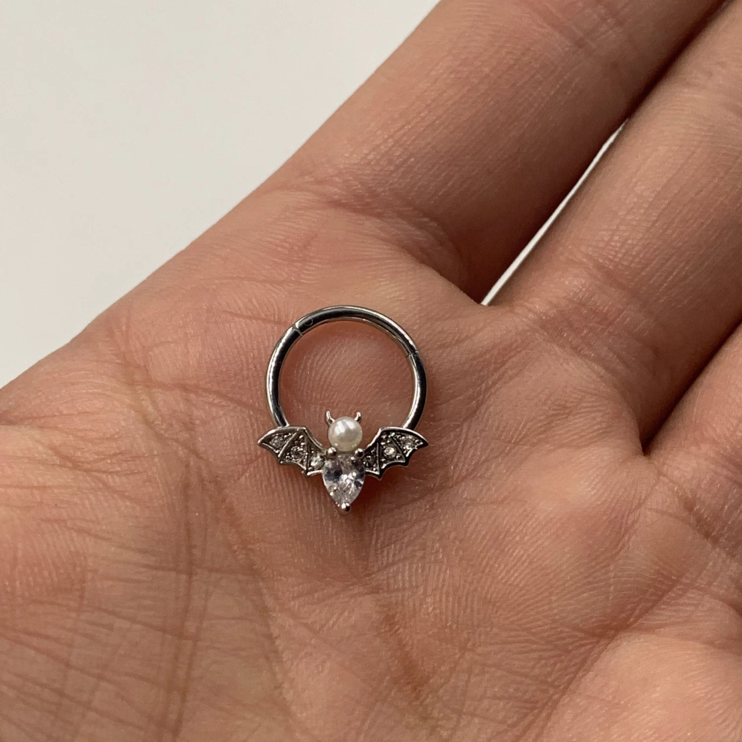 - The bat’s body is a single oval clear gem while its head is a white pearlescent orb.
