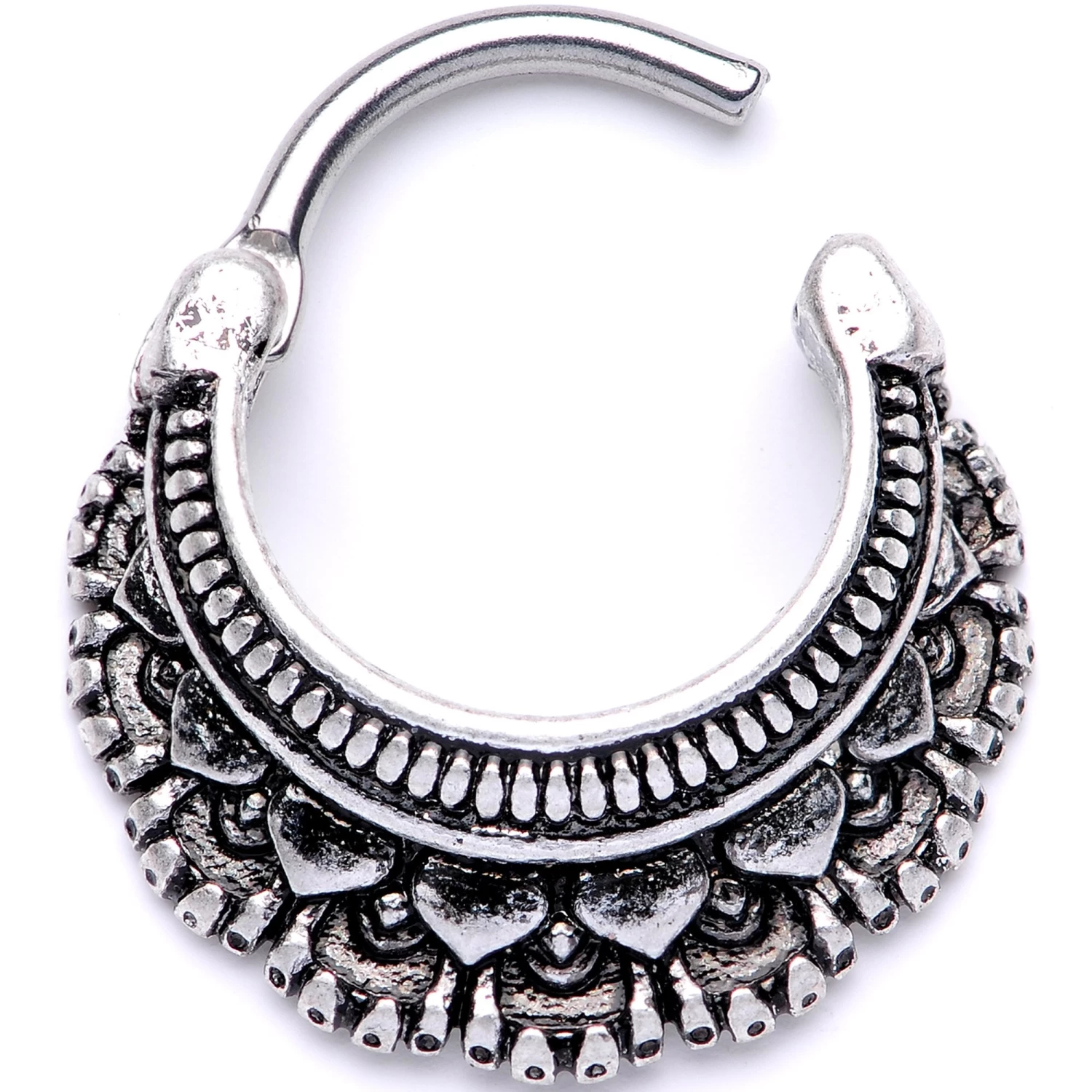 If you’re looking for fashionable selections for your septum piercing then you will love this 16 gauge nose ring. Made with a 10mm durable 316L surgical grade stainless steel hinged curved barbell, this cartilage clicker features a uniquely designed, eye-catching bottom arc that will draw the eye and can be worn in your septum piercing, cartilage piercings, and more.