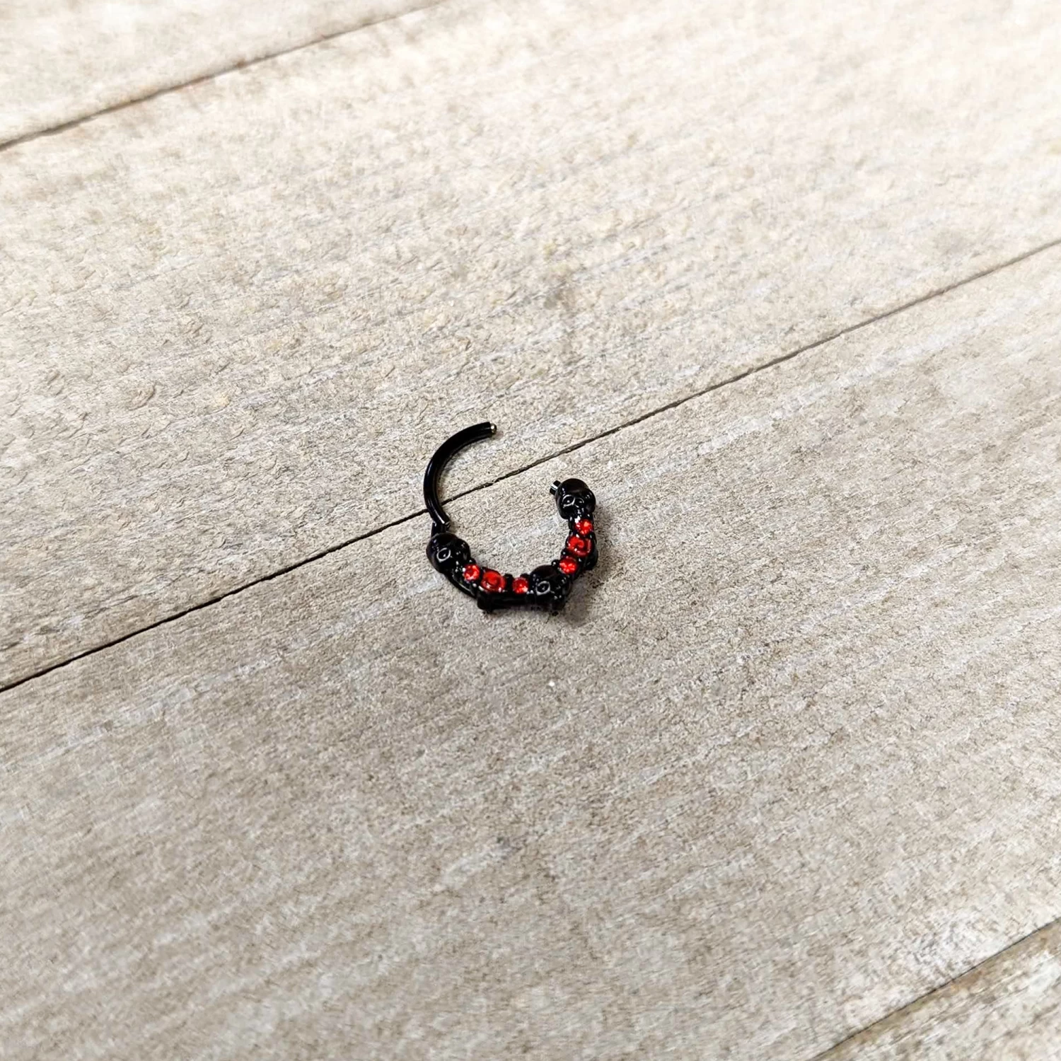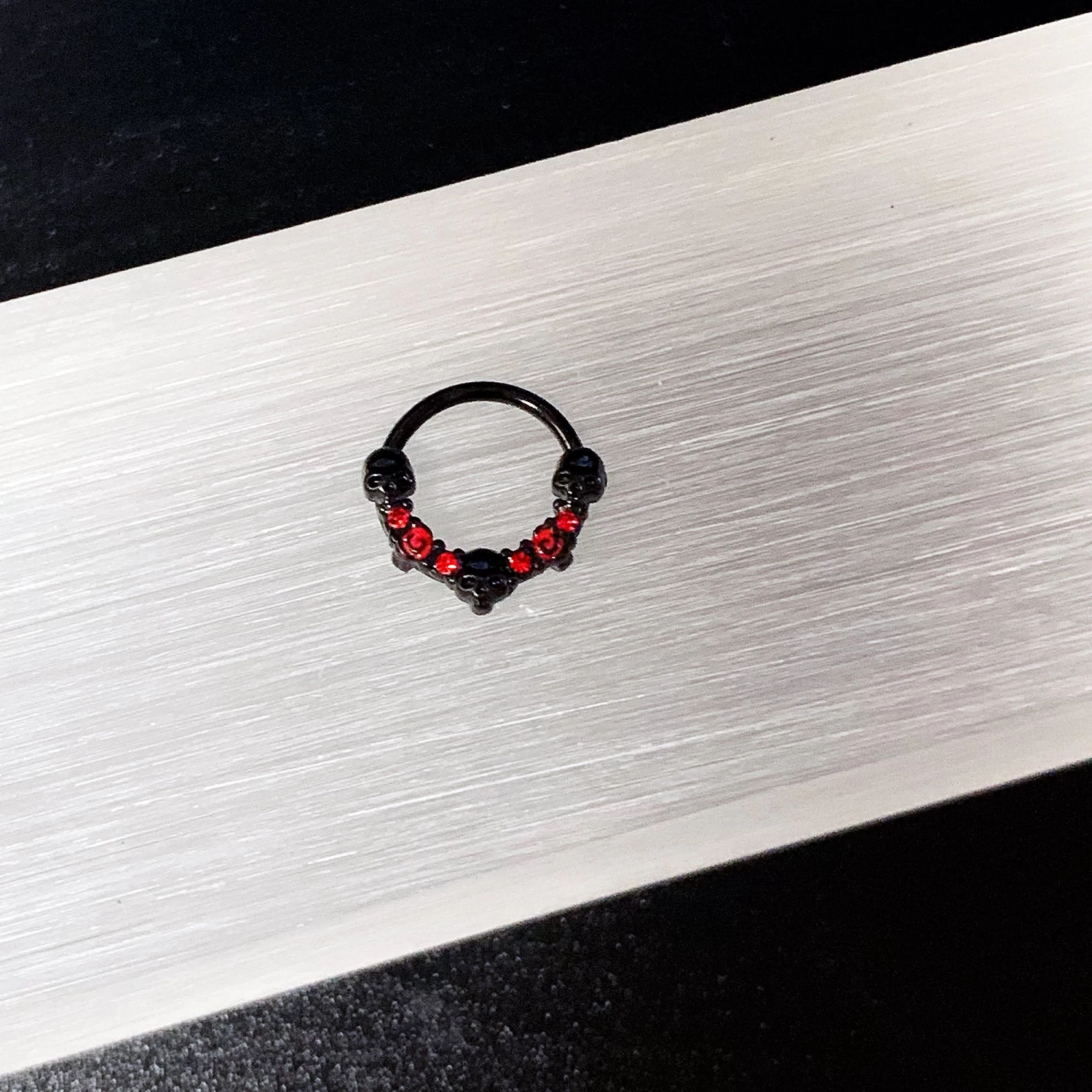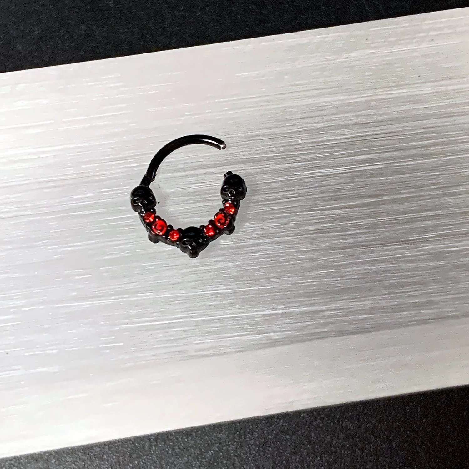 If skulls and all things creepy make your heart beat faster, this 16 gauge septum ring is for you! It’s made with a 10mm black anodized over 316L surgical grade stainless steel hinged circular ring. It features a trio of skulls, in matching black for a cohesive look. The the skulls are separated by alternating clear and red cubic zirconia gems for a look that’s sure catch everyone’s eye! It also features a non-removable, hinged segment that makes insertion and removal a snap. And you can wear it in multiple piercings including septum, helix, and tragus. For Halloween or all year long, add some gothic glamour to your cartilage piercing with this frighteningly fashionable cartilage jewelry!