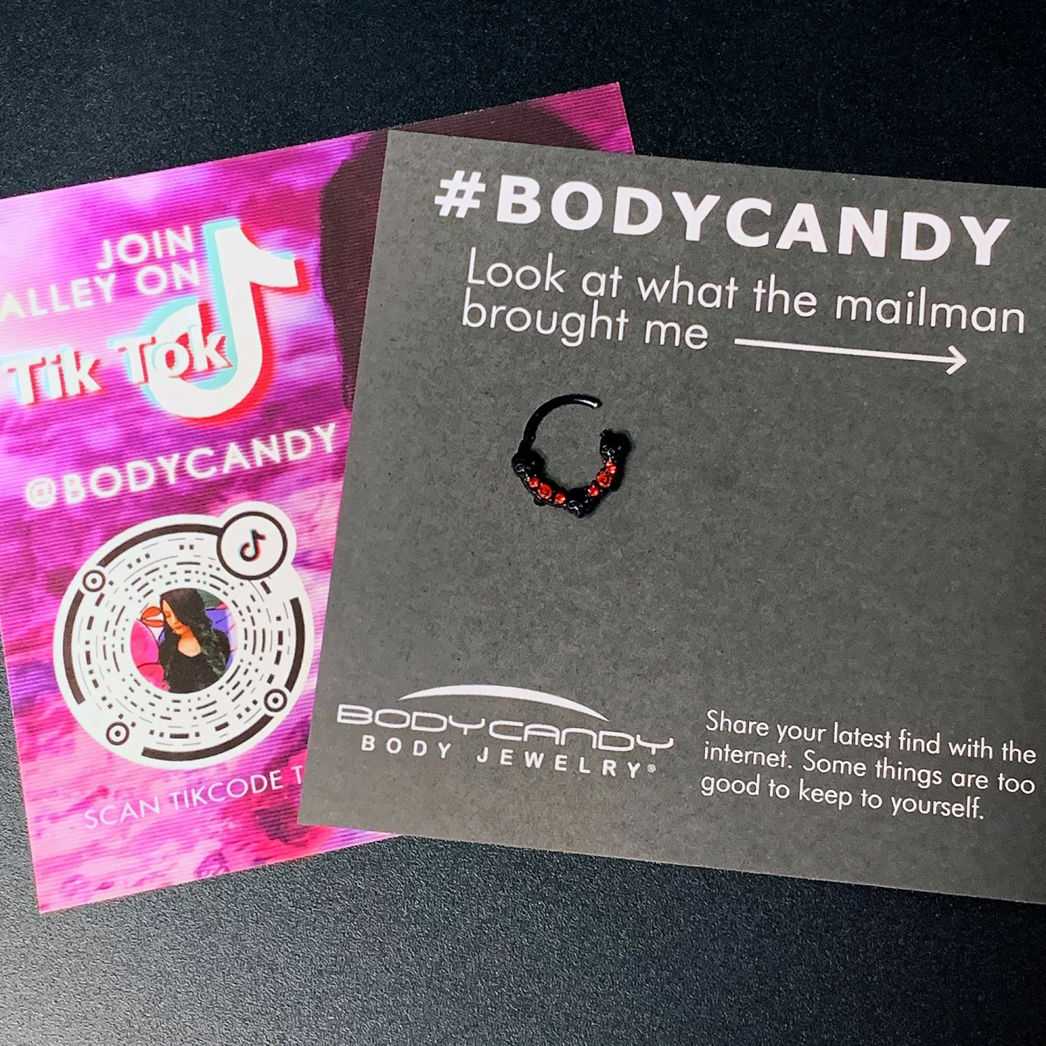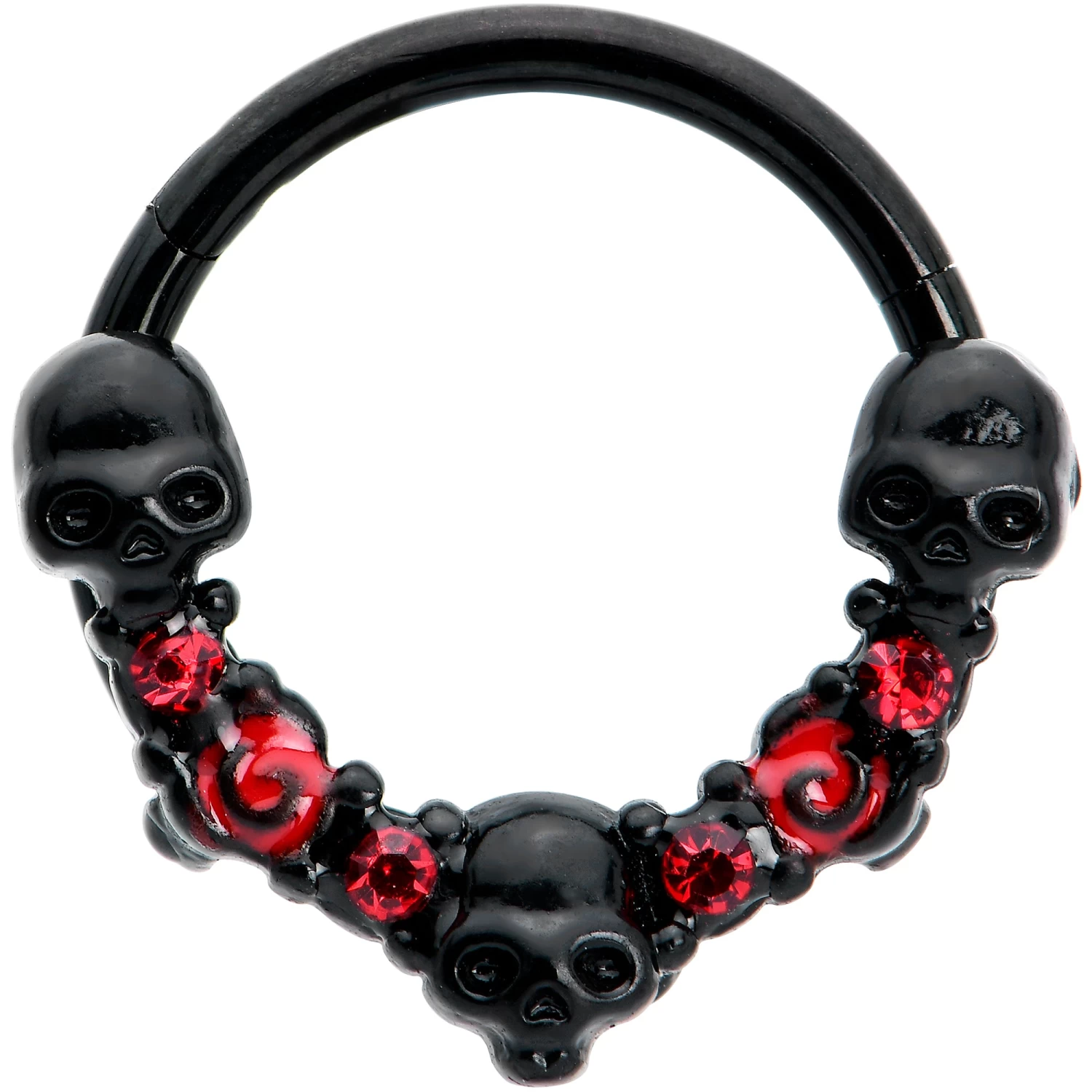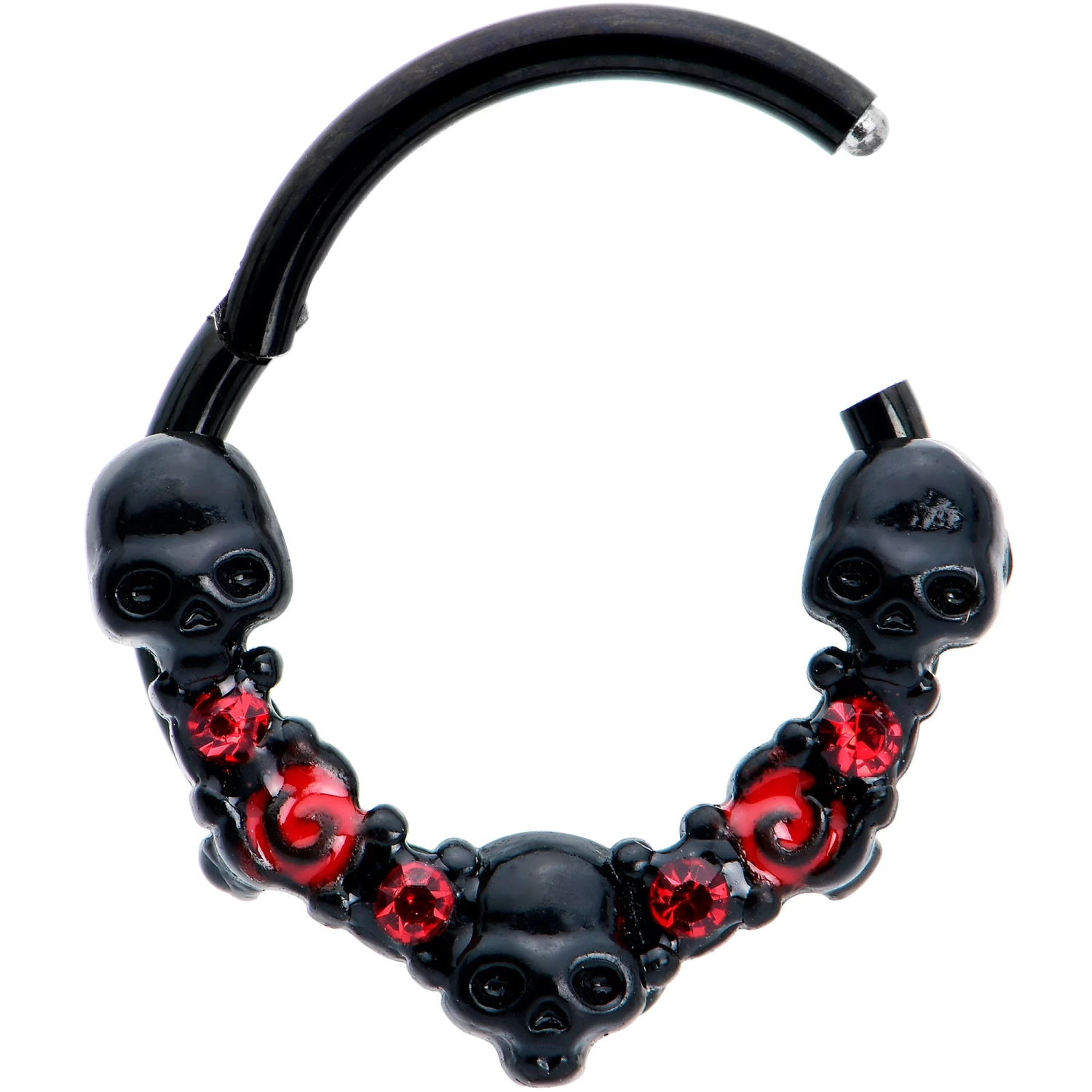 If skulls and all things creepy make your heart beat faster, this 16 gauge septum ring is for you! It’s made with a 10mm black anodized over 316L surgical grade stainless steel hinged circular ring. It features a trio of skulls, in matching black for a cohesive look. The the skulls are separated by alternating clear and red cubic zirconia gems for a look that’s sure catch everyone’s eye! It also features a non-removable, hinged segment that makes insertion and removal a snap. And you can wear it in multiple piercings including septum, helix, and tragus. For Halloween or all year long, add some gothic glamour to your cartilage piercing with this frighteningly fashionable cartilage jewelry!
