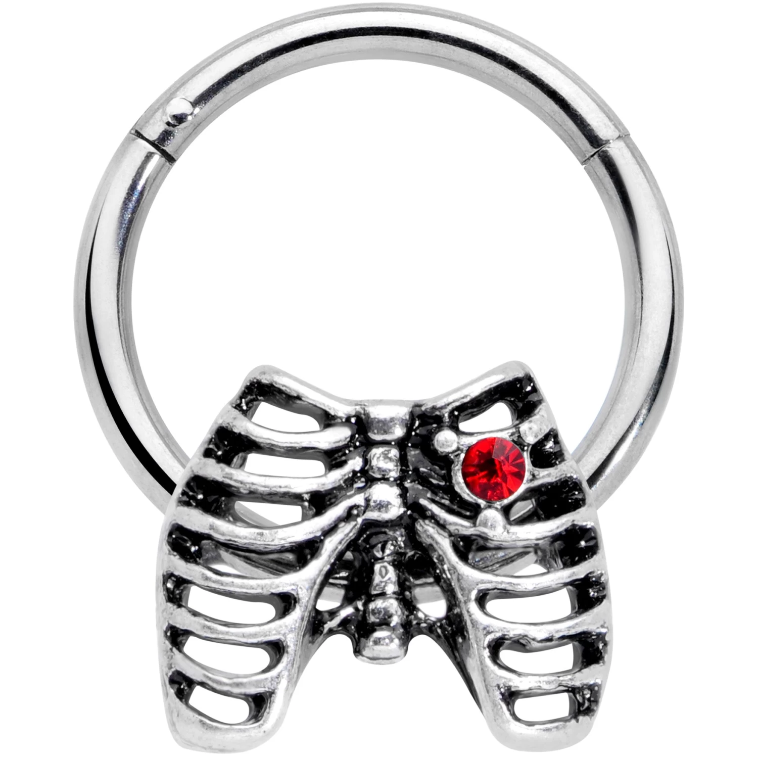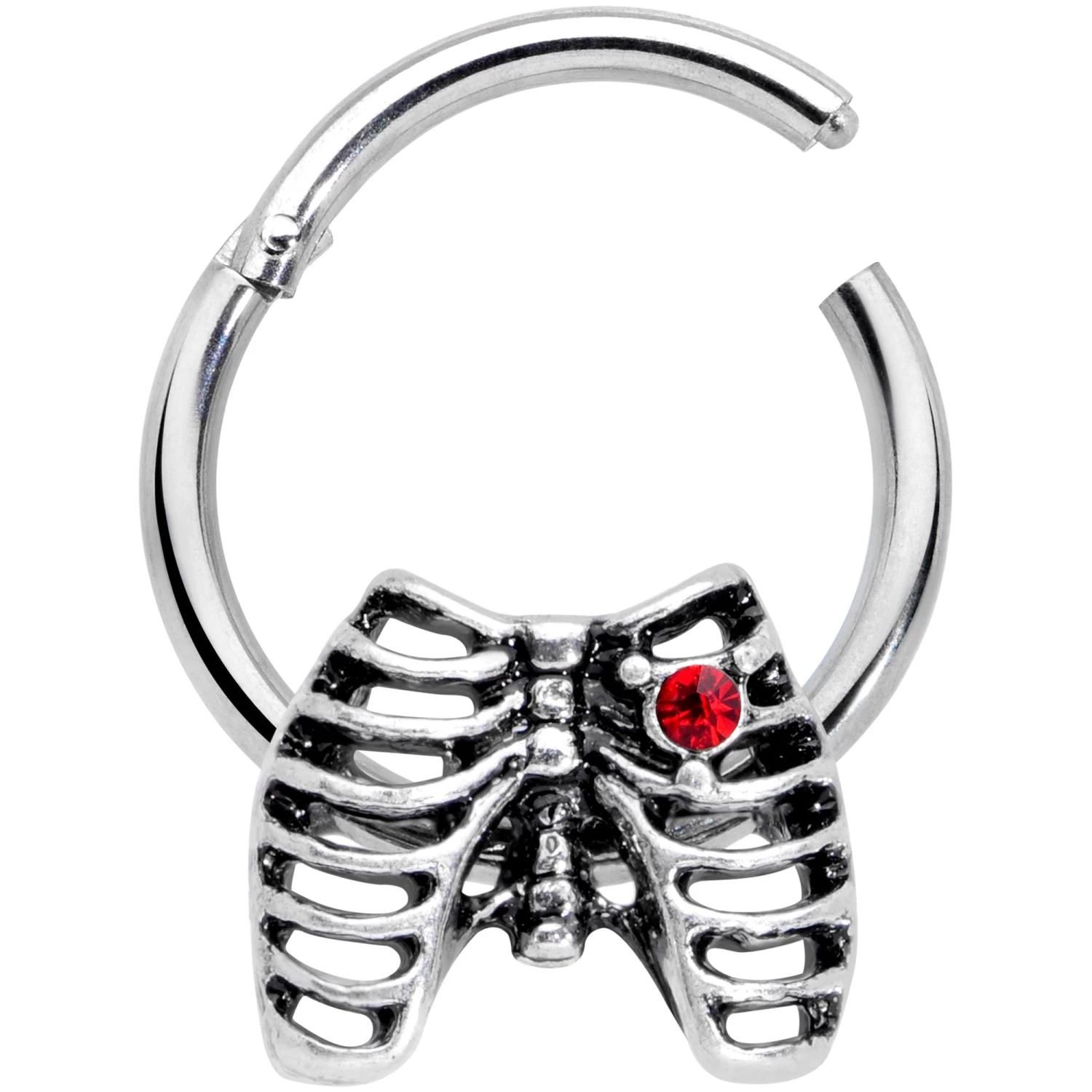 Whether you’re smitten with skeletons or hungry for love, this 16 gauge septum ring is sure to say it all! It’s made with a 10mm durable 316L surgical grade stainless steel hinged circular ring. It features a rib cage charm, with each rib carefully detailed. The rib cage is set with a red cubic zirconia gem heart, adding extra color and style. It also features a non-removable, hinged segment that makes insertion and removal a snap. You can also wear it in multiple piercings including tragus, helix, and septum piercings. Perfect for Halloween, this cartilage jewelry will have you loving your piercings all year round!