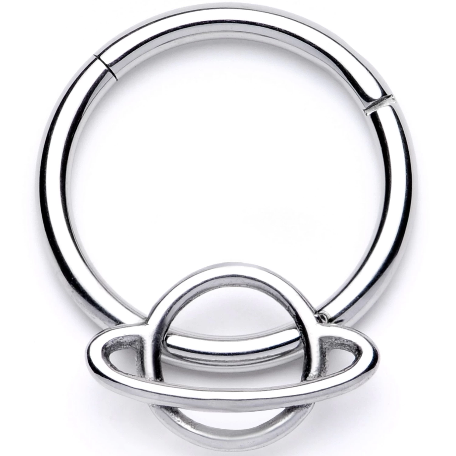 This cartilage earring is out of this world! This 16 gauge universal ring is made with a 10mm durable 316L surgical grade stainless steel hinged circular ring. It features an openwork embellishment of the planet Saturn, complete with the planet’s ring. This ring features a non-removable hinged segment that makes it super easy to insert and remove. This is something you’ll love because it works so well in multiple piercings including the septum, daith, tragus, and helix. You’ll want to wear this everywhere….even outer space!