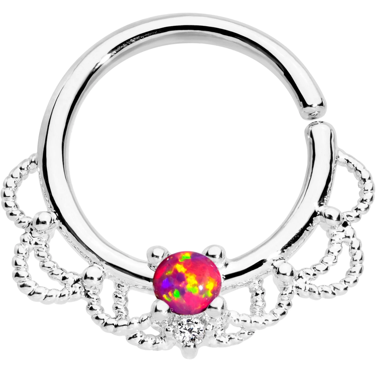 Embrace the art of graceful glamour and subtle style when you wear this simple, beautiful 16 gauge septum jewelry. Made with an adjustable 10mm platinum plated over brass circular barbell, this septum piercing features a bendable bar for easy insertion as well as a notched filigree style bottom charm set with a red cubic zirconia gem. Simply give this nose ring a gentle twist, insert into piercing, and bend shut for a perfect fit!