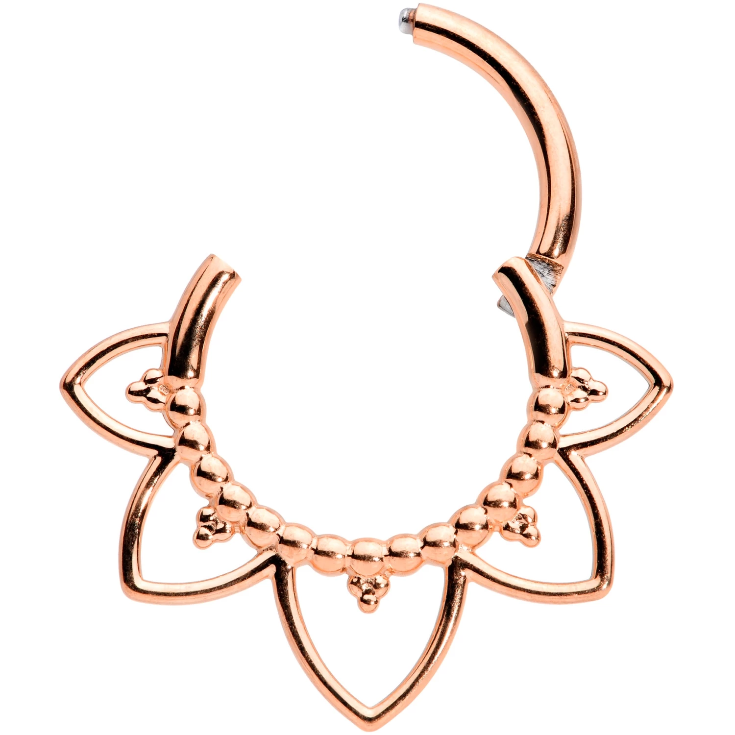 Be open to the world, like the flower on this 16 gauge jewelry! It’s made with an 8mm rose gold tone PVD over 316L surgical grade stainless steel hinged circular ring. It features an open design shaped like petals, with filigree detailing along the bottom rim. It also features a hinged, non-removable segment that makes insertion and removal a snap. And you can rock this ring in multiple piercings including septum, tragus, and helix! With elegant styling and thoughtful detailing, you can’t help but blossom with this filigree flower cartilage ring!