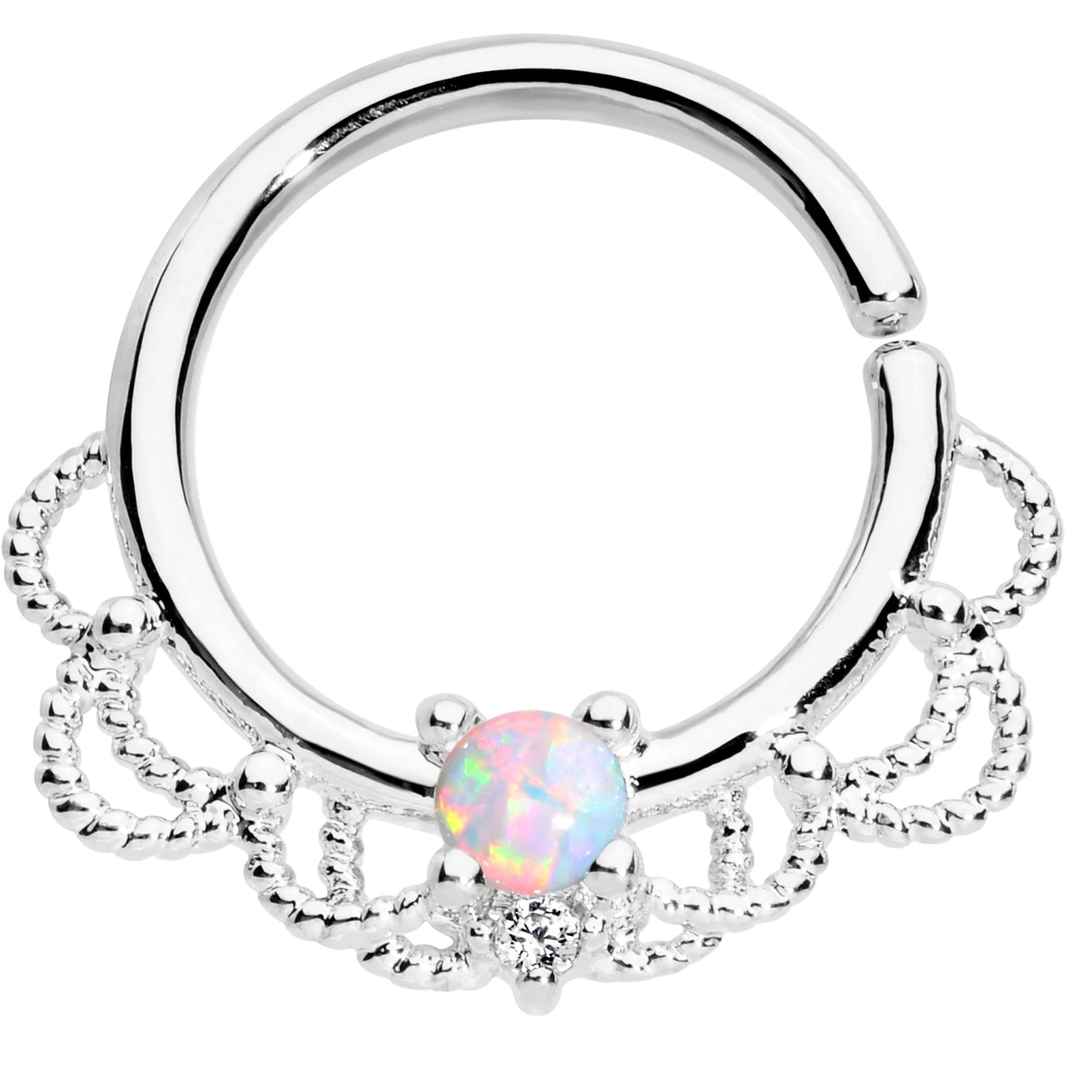 Embrace the art of graceful glamour and subtle style when you wear this simple, beautiful 16 gauge septum jewelry. Made with an adjustable 8mm platinum plated over brass circular barbell, this septum piercing features a bendable bar for easy insertion as well as a notched filigree style bottom charm set with a white faux opal gem. Simply give this nose ring a gentle twist, insert into piercing, and bend shut for a perfect fit!