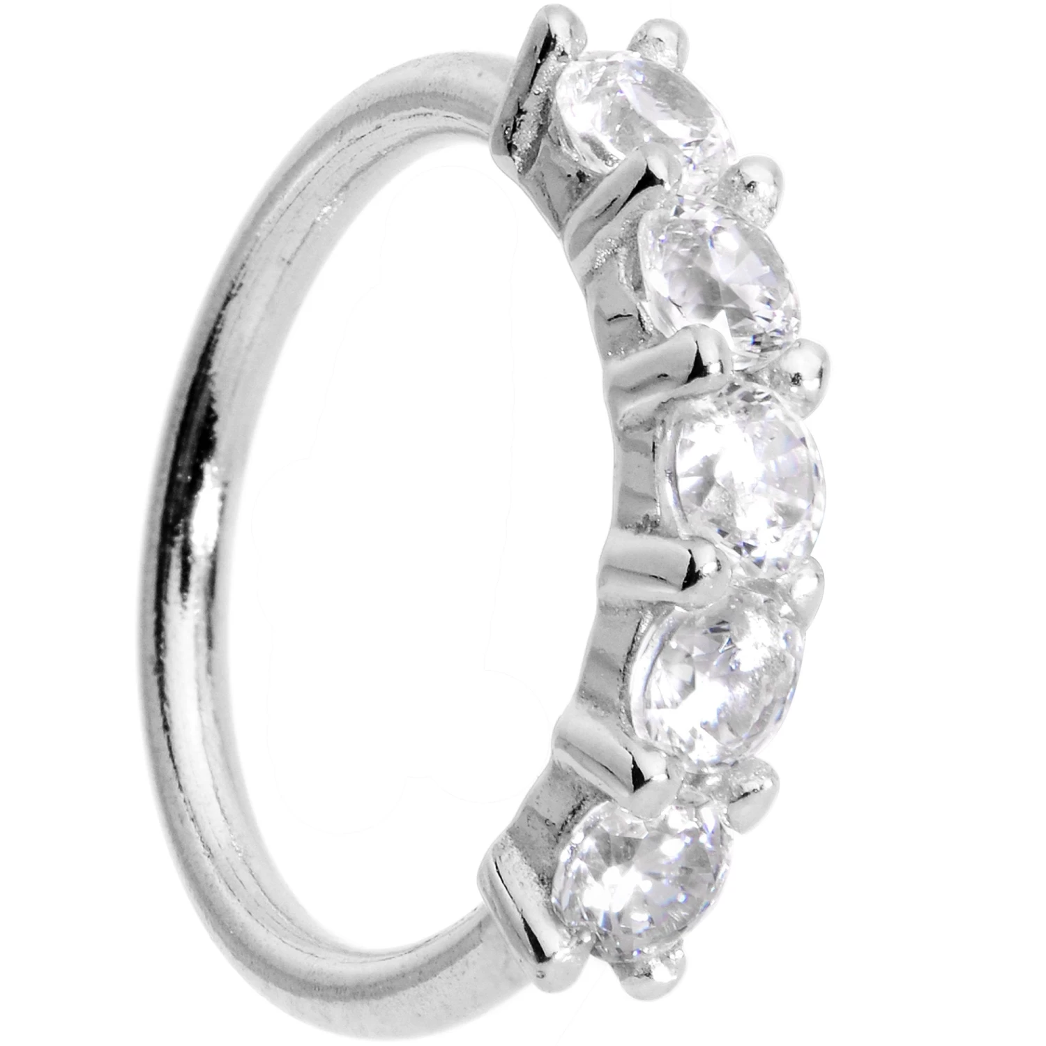 You’ll feel like the belle of the ball while you’re wearing this 18 gauge universal body jewelry encrusted with five clear cubic zirconia gems. The 1/4″ circular ring is made with 14k white gold, and is bendable for ease of use. To insert ring simply twist then squeeze rounded ends together and you’re ready to go. Can be worn in a variety of piercings including your cartilage, daith, tragus, lip, nose, and any other body piercing that is a perfect fit for you!