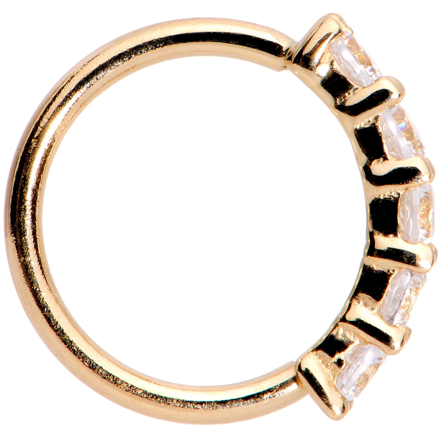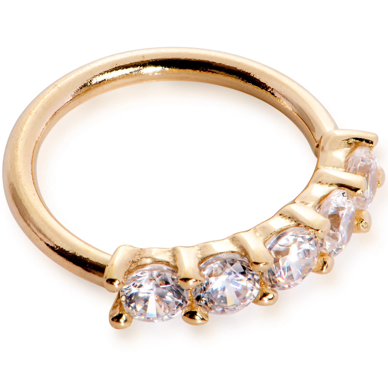 You’ll feel like the belle of the ball while you’re wearing this 18 gauge universal body jewelry encrusted with five clear cubic zirconia gems. The 1/4″ circular ring is made with 14k yellow gold, and is bendable for ease of use. To insert ring simply twist then squeeze rounded ends together and you’re ready to go. Can be worn in a variety of piercings including your cartilage, daith, tragus, lip, nose, and any other body piercing that is a perfect fit for you!