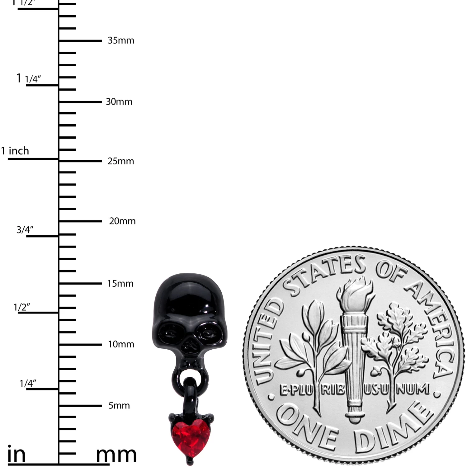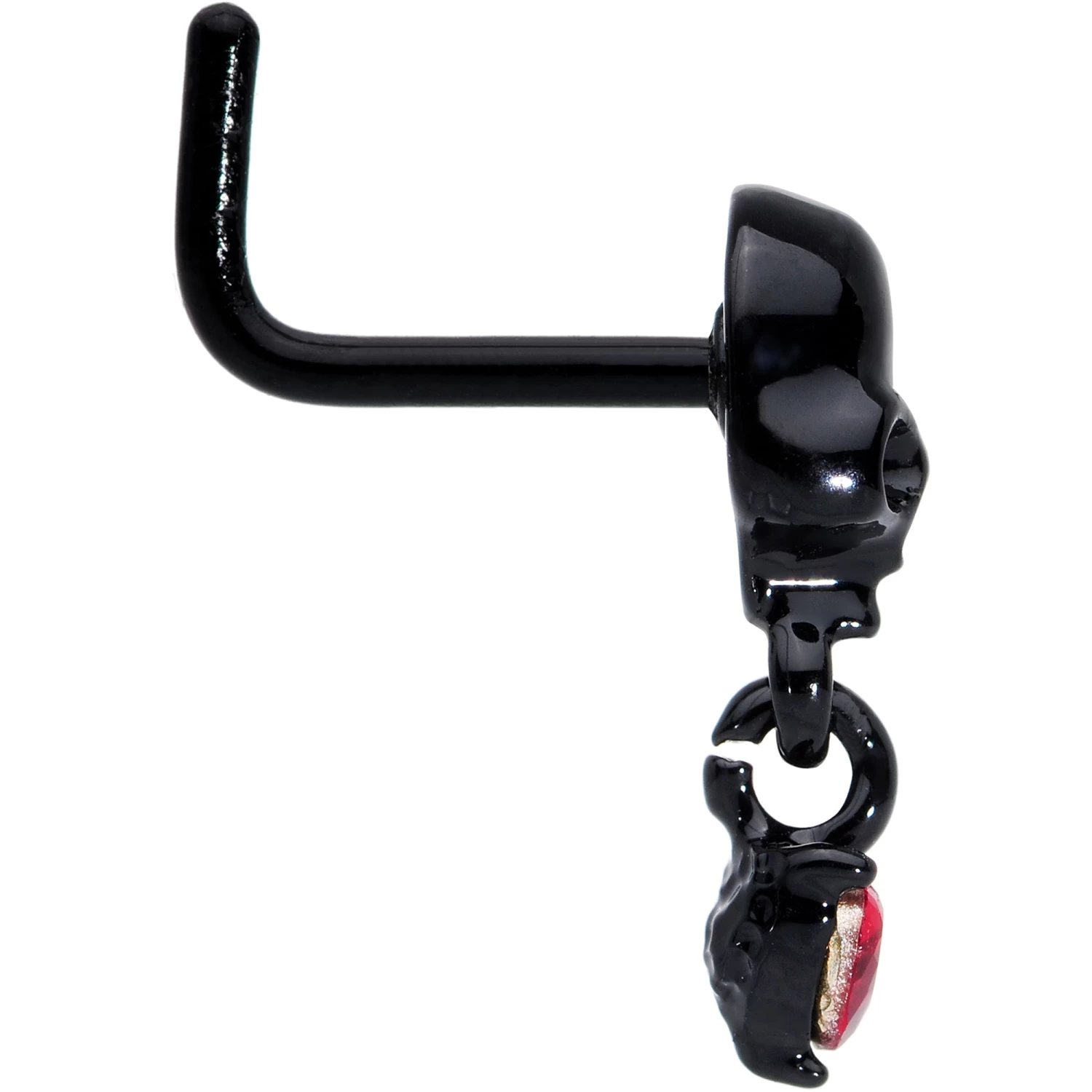 If skulls and all things creepy make your heart beat faster, this 18 gauge nostril ring is for you! It’s made with a 6mm length at the bend black anodized over 316L surgical grade stainless steel L-shaped post. The front features a skull charm, in matching black for a cohesive look. Dangling from the skull is a red cubic zirconia gem, in the shape of a heart. The color contrast packs a powerful punch of spooky style that you can’t help but love! For Halloween or all year long, add some gothic glamour to your nose piercing with this frighteningly fashionable nostril jewelry!
