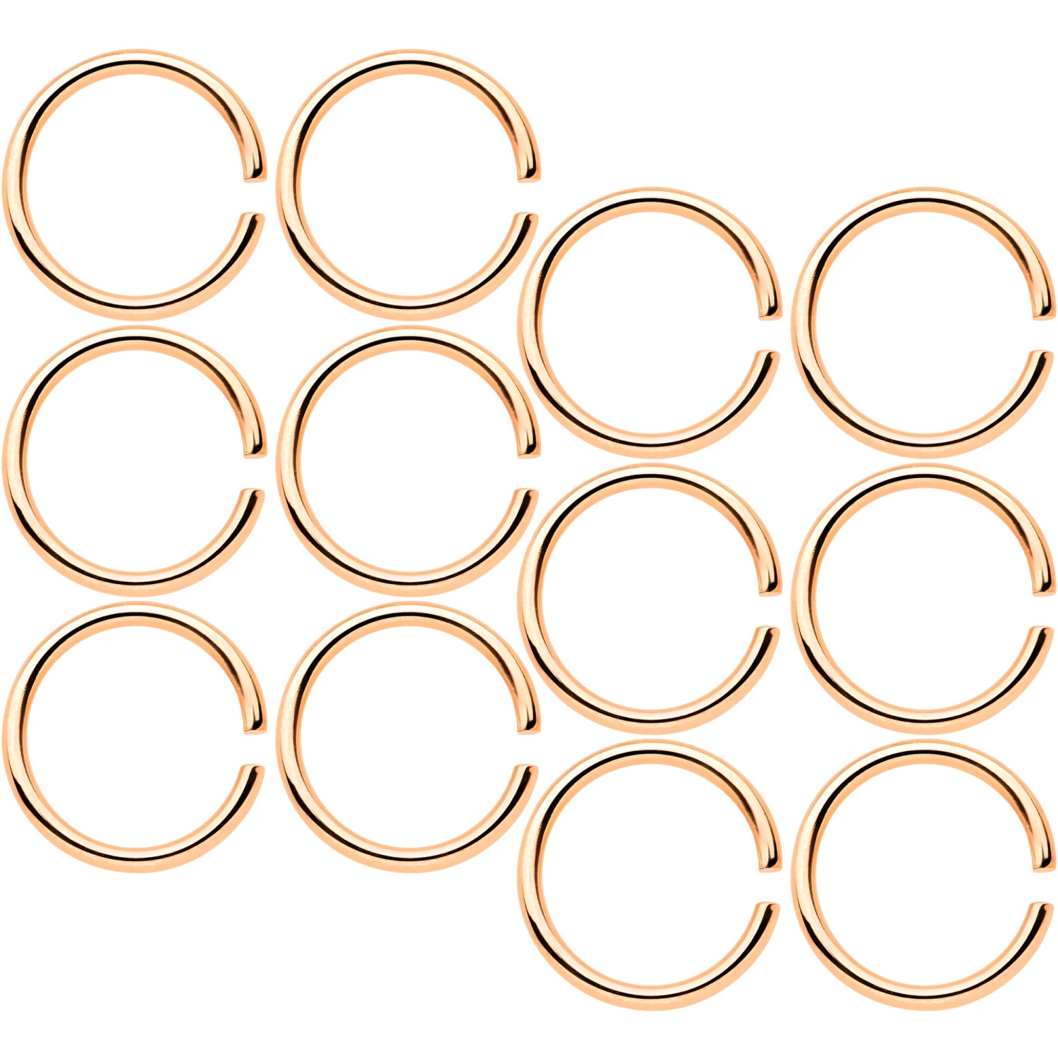 Whether you have multiple nostril piercings and prefer a matching look or are simply prone to losing things, this set of 18 gauge nose rings has you covered. They’re made with 8mm rose gold tone anodized over 316L surgical grade stainless steel circular rings for a colorful and comfortable feel. This nostril jewelry is super easy to insert and remove – simply twist the ring open, insert, and then twist gently shut again. And with so many in the set, you can be sure of always having a beautiful nose ring to wear! Sold as a set of twelve. These are universal seamless rings for multiple body piercings including ear, lip and septum or nose.