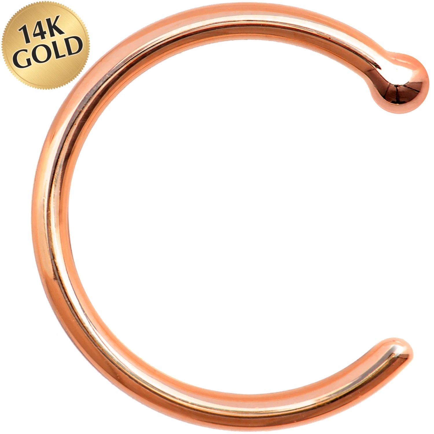 18 gauge nose hoop constructed of solid 14k gold. Simply insert the opening of the hoop through the nostril. Twist and turn through piercing until the ball on the end is resting against the inner part of the nostril. Solid gold nose hoop. Classic rose gold nose ring is a timeless piercing.