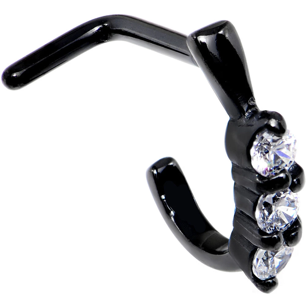 Embrace a whole new look for your nose piercing when you wear this unique nose ring that looks like a hoop! Made with a 5/16″ length black PVD coated surgical grade stainless steel L-shaped post, this nostril piercing features three clear gems set on half of a hoop that sits outside of your nostril to give the illusion of a hoop in your regular (pierced!) nose piercing. Whether you are into hoops and don’t like the way they fit or just want to try something new this style of nose jewelry may be right for you!