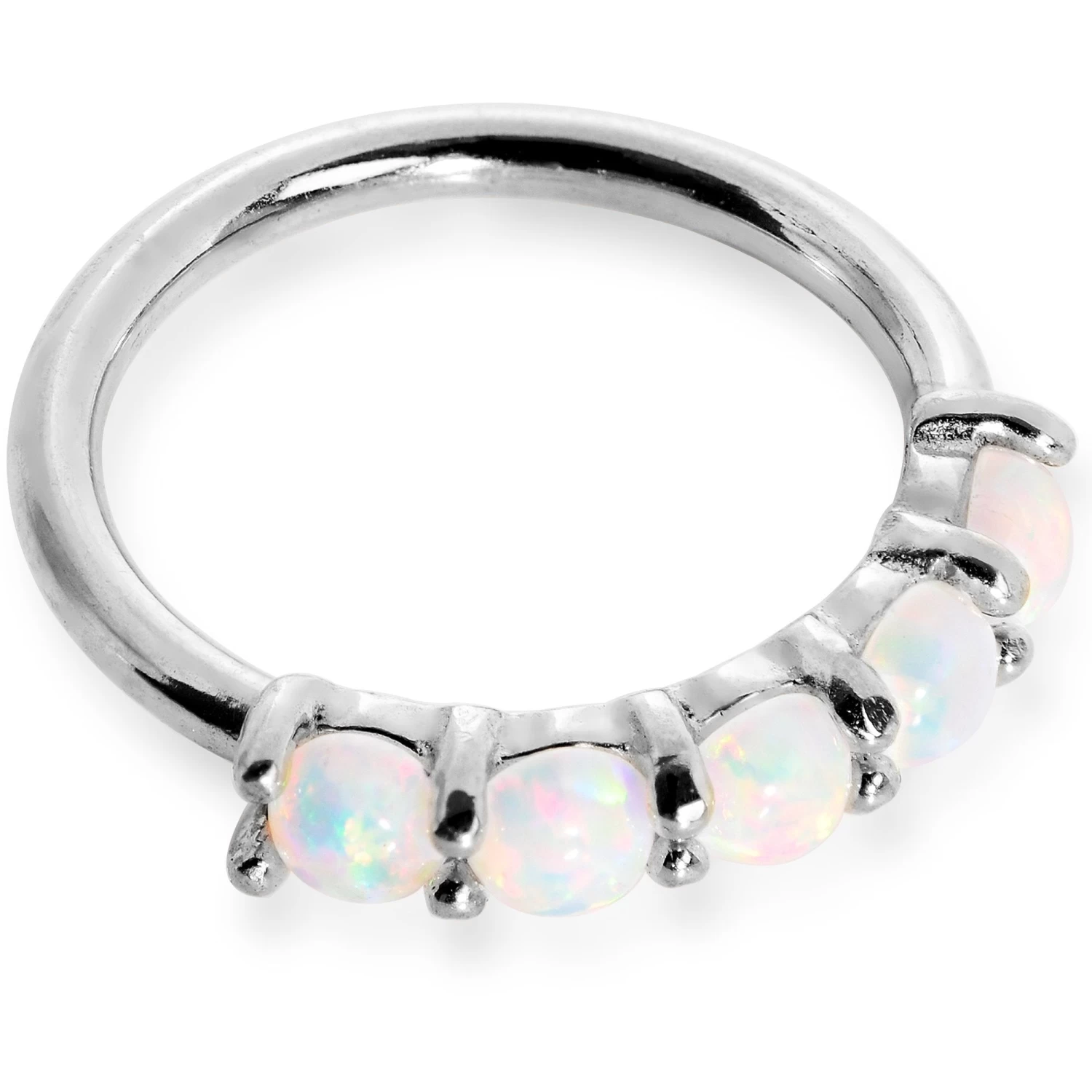 You’ll feel like the belle of the ball while you’re wearing this 18 gauge universal body jewelry encrusted with five white synthetic opals. The 1/4″ circular ring is made with 14k white gold, and is bendable for ease of use. To insert ring simply twist then squeeze rounded ends together and you’re ready to go. Can be worn in a variety of piercings including your cartilage, daith, tragus, lip, nose, and any other body piercing that is a perfect fit for you!