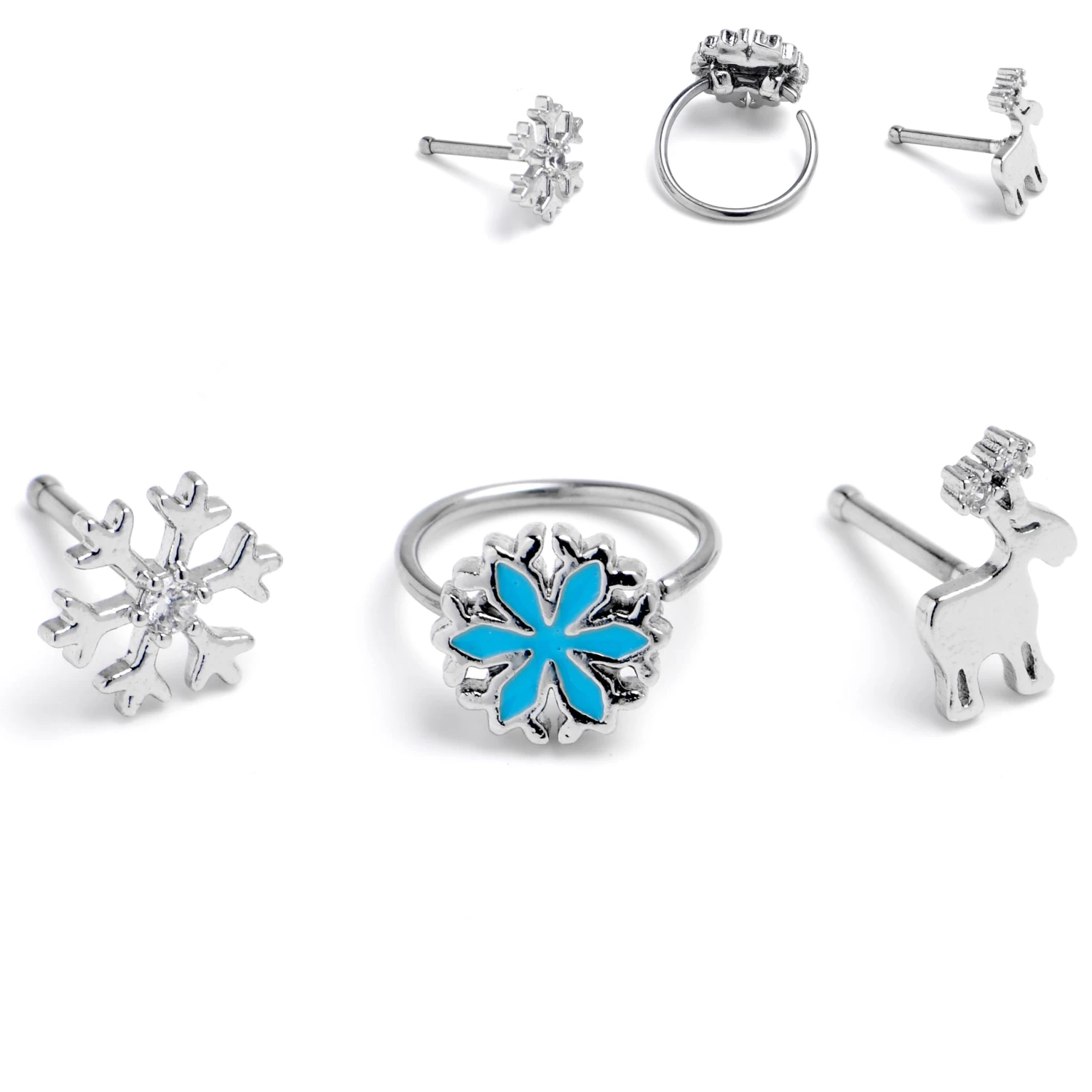Get festive all year round with this set of 20 gauge nostril jewelry! You get two 6mm nose bones made with 316L surgical grade stainless steel straight posts. One features a reindeer charm with clear gems set in the antlers. The other features a simple styled snowflake with a clear gem center. You also get a nose hoop made 6mm durable 316L surgical grade stainless steel circular ring. It features a snowflake charm with contrasting blue embellishment. You will have a festive holiday look for every occasion with this set of nose piercing rings. Sold as a set of three.