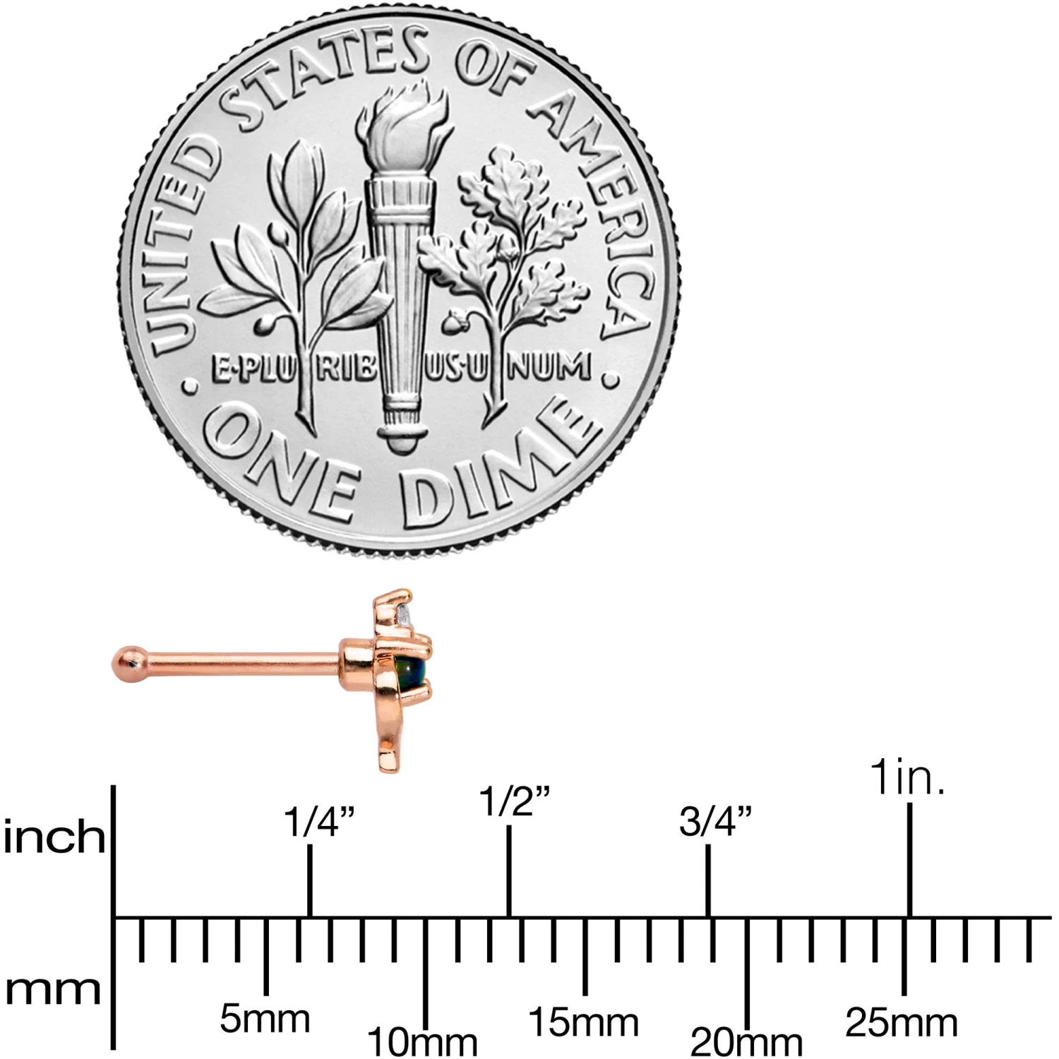 This 20 gauge fashion nose ring is sure to catch your eye! It’s made with a 6mm rose gold tone PVD over 316L surgical grade stainless steel straight post. It features a deco charm with a clear cubic zirconia gem and a green synthetic opal gem too for a stylish look. Put a whole new twist in your look with this on-trend and super stylish nostril jewelry!