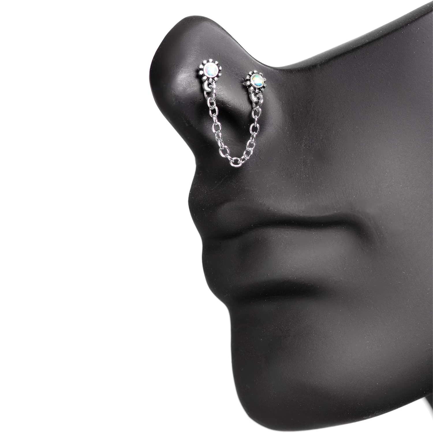 If you’ve got multiple nose piercings and are looking for brand new body jewelry then check out this 20 gauge double nose bone chain jewelry that you can wear in your multiple nostril piercings. Made with 6mm durable 316L surgical grade stainless steel posts, this double nose piercing jewelry features white synthetic opal ends and two nose bones connected by a dangle chain that can be worn in two piercings in one nostril or in high nostril piercings on either side of your nose.
