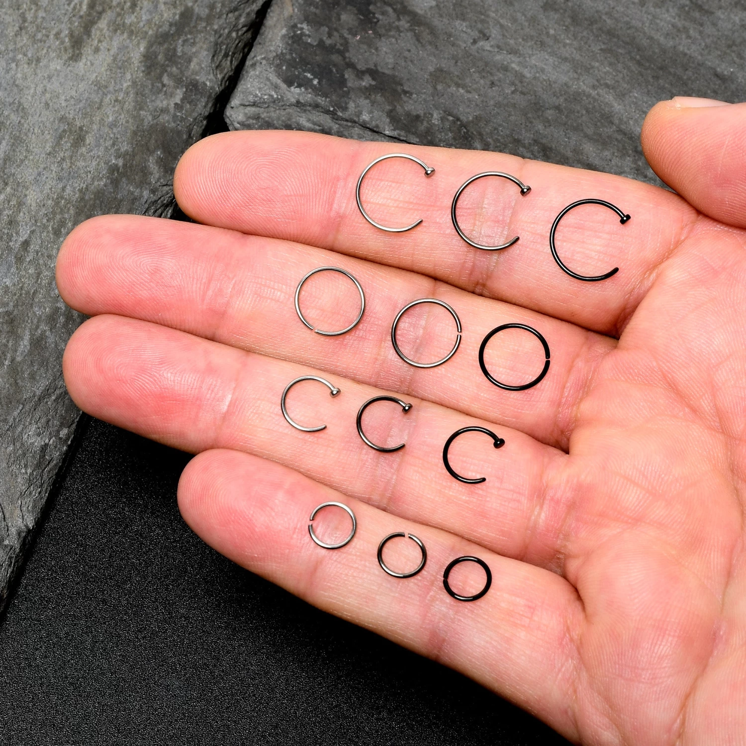 20 Gauge (.8mm), 1/4″ (6mm) Hoops, 5/16″ (8mm) Half Hoops, 3/8″ (10mm) Hoops, 1/2″ (12mm) Half Hoops, ASTM F-136 Titanium Circular Rings, Sold as a Set of 12