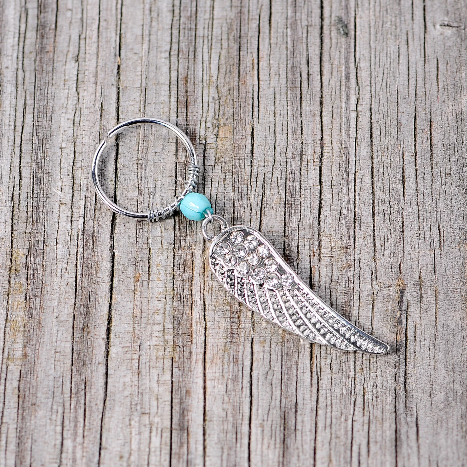 Looking for something unique to add to your body jewelry collection? This 20 gauge cartilage earring might be just what gives your piercing wings! It’s made with a 10mm durable 316L surgical grade stainless steel circular ring and features a fancy clear gem-encrusted feathered wing dangle charm decorated with a seafoam blue orb. And it’s super easy to insert and remove – simply twist open, insert, and then twist gently shut again. You’ll love this feature because it works so well in multiple piercings like your lobe as well as some pierced cartilage and helix piercings! Take your look into the heavens with this heavenly wing cartilage ring!