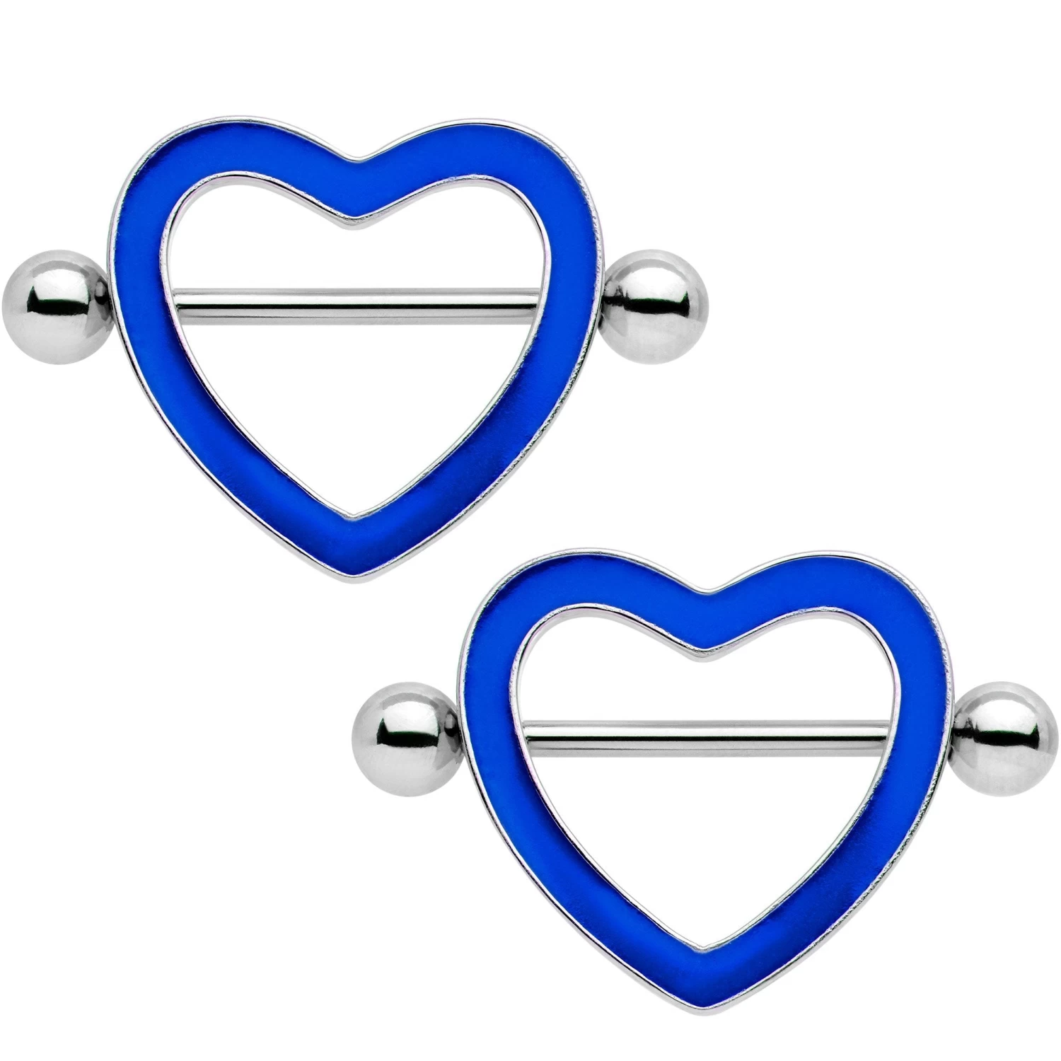 Let your heart glow with all of your love when you wear this pretty pair of 14 gauge nipple shield piercings. Made with 19mm durable 316L surgical grade stainless steel straight barbells, this set of nipple shields features blue glow in the dark heart shield charms. This pair of nipple barbells is sold as a set of two for “de seins,” of course, and anyone who gets to take in the view. Perfect for Valentine’s Day or any occasion.
