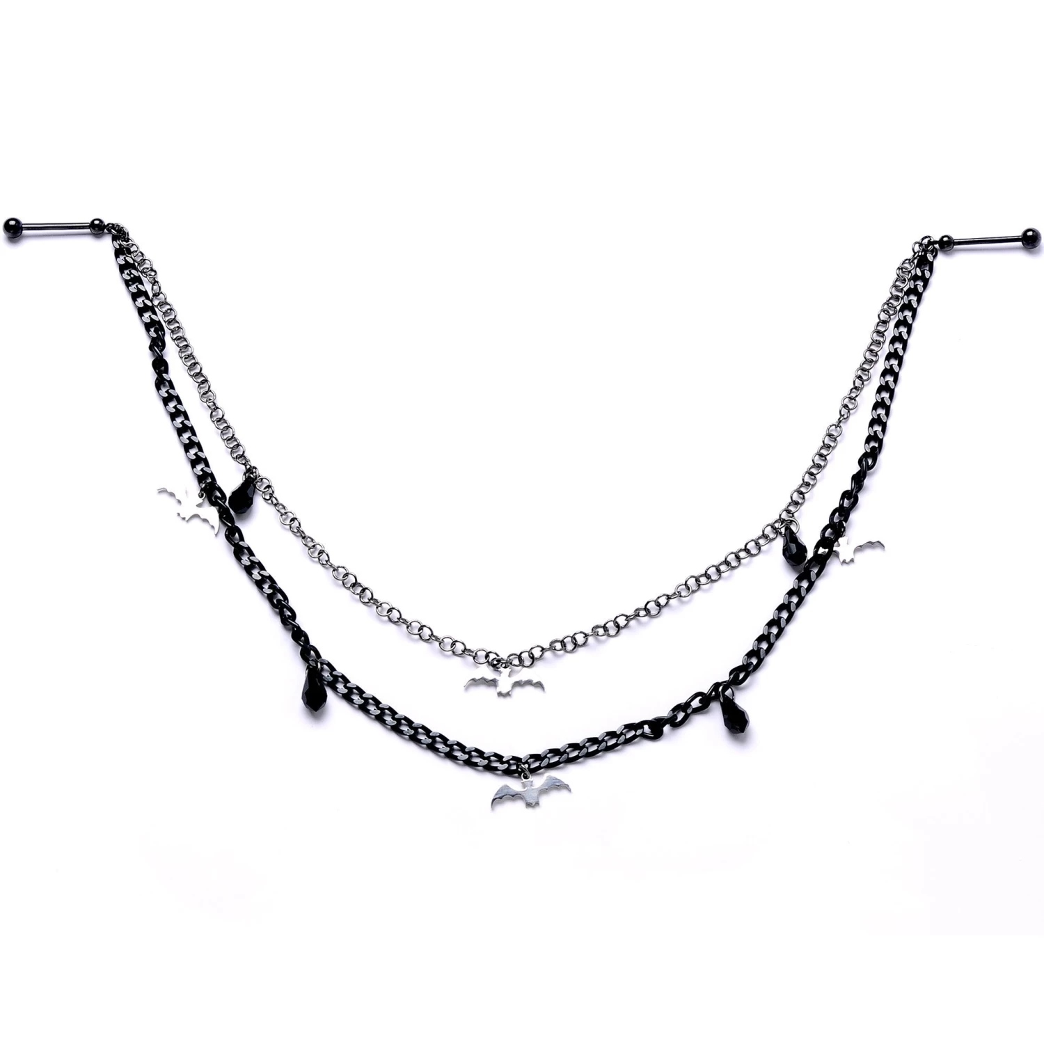 Happy Halloween, ladies! Whether you want to dress up your breasts for your favorite fall holiday or you love to feel a little spooky all year round you will want to take a look at this 14 gauge chain dangle nipple jewelry with a little scary spirit. Featuring a 12″ aluminum plated chain and 14″ gunmetal plated chain with bat charms and black crystals, this nipple piercing is made with 5/8″ black titanium ion plated over 316L surgical grade stainless steel straight barbells, is handcrafted in the USA, and created with crystals. Boo!