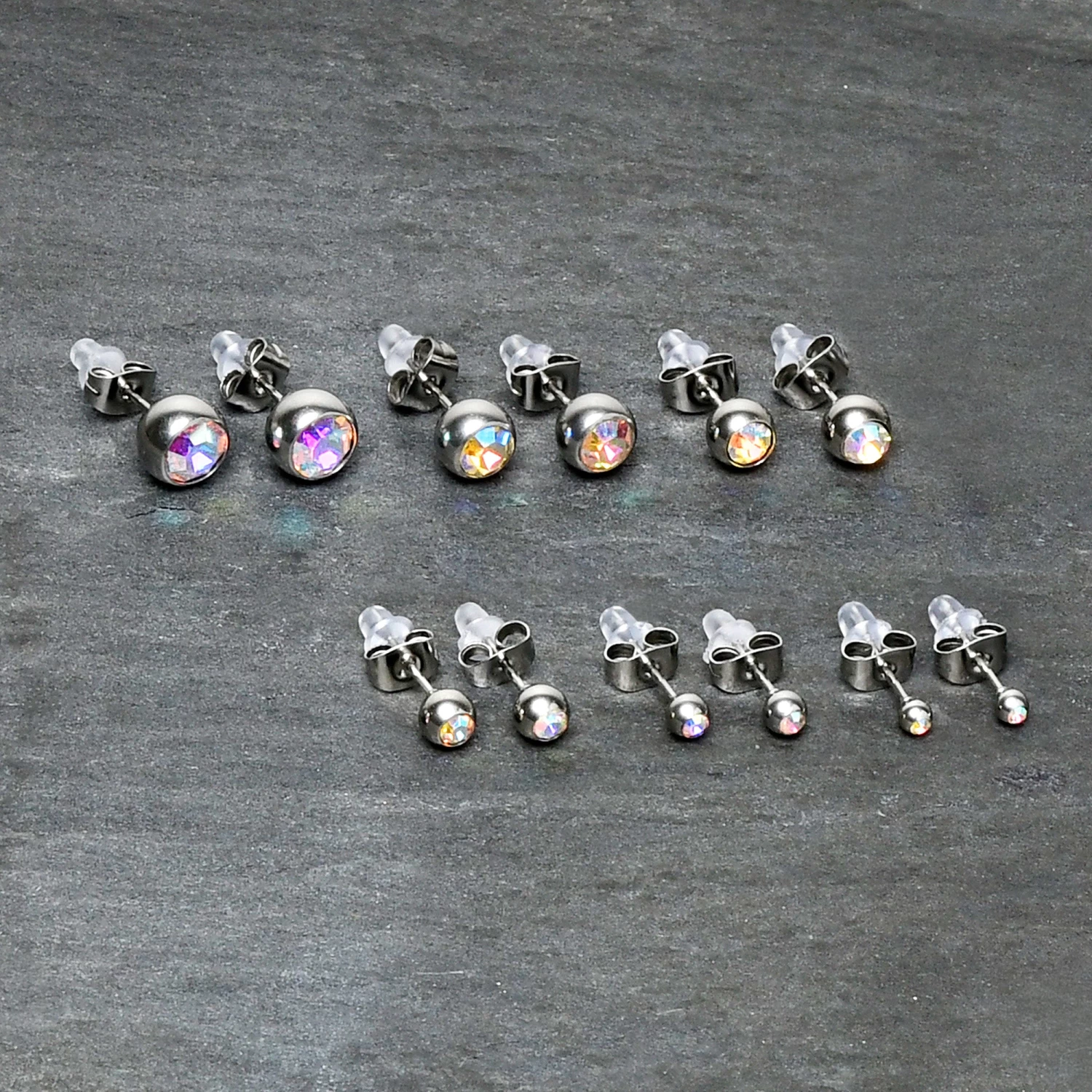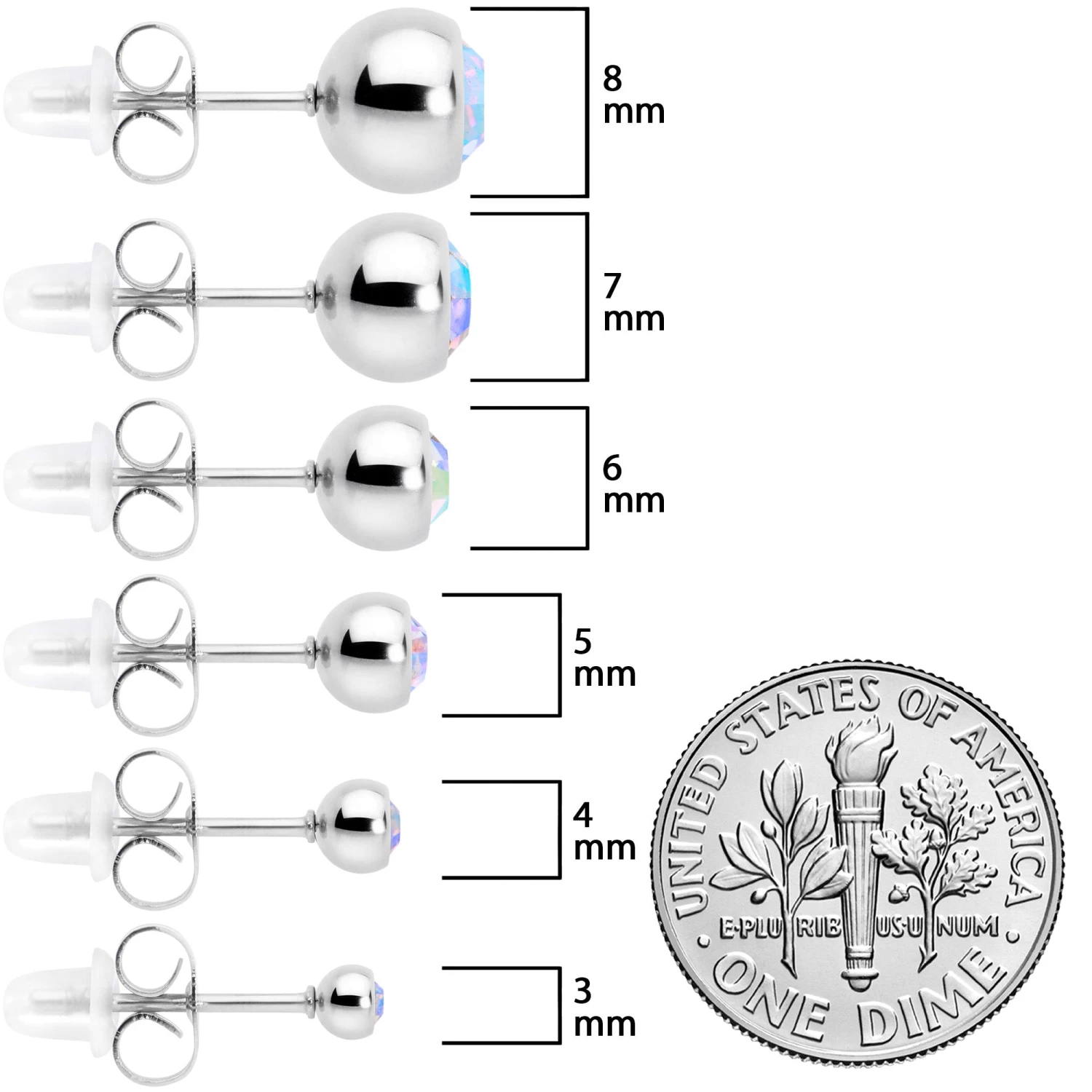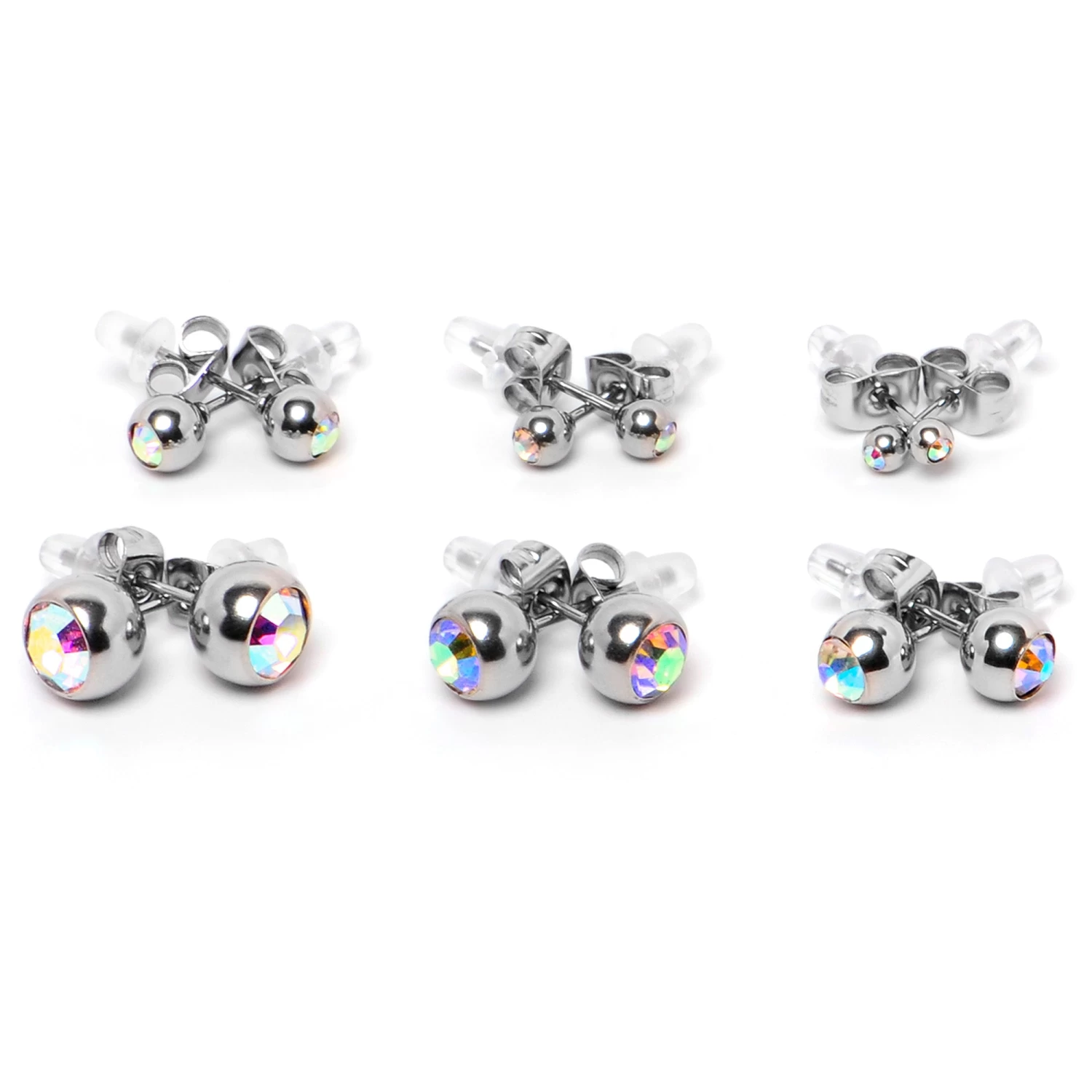 If you are looking for classic style that goes with everything, these 20 gauge earrings will have you ready for any occasion. They are made with 316L surgical grade stainless steel straight posts and have butterfly style friction backs for a secure fit. They feature simple ball ends that are set with aurora gems. You get one pair each in 3mm, 4mm, 5mm, 6mm, 7mm, and 8mm for a touch of classic chic to go with every look. These are sure to add some simple elegance to your pierced lobes. Sold as a set of six.