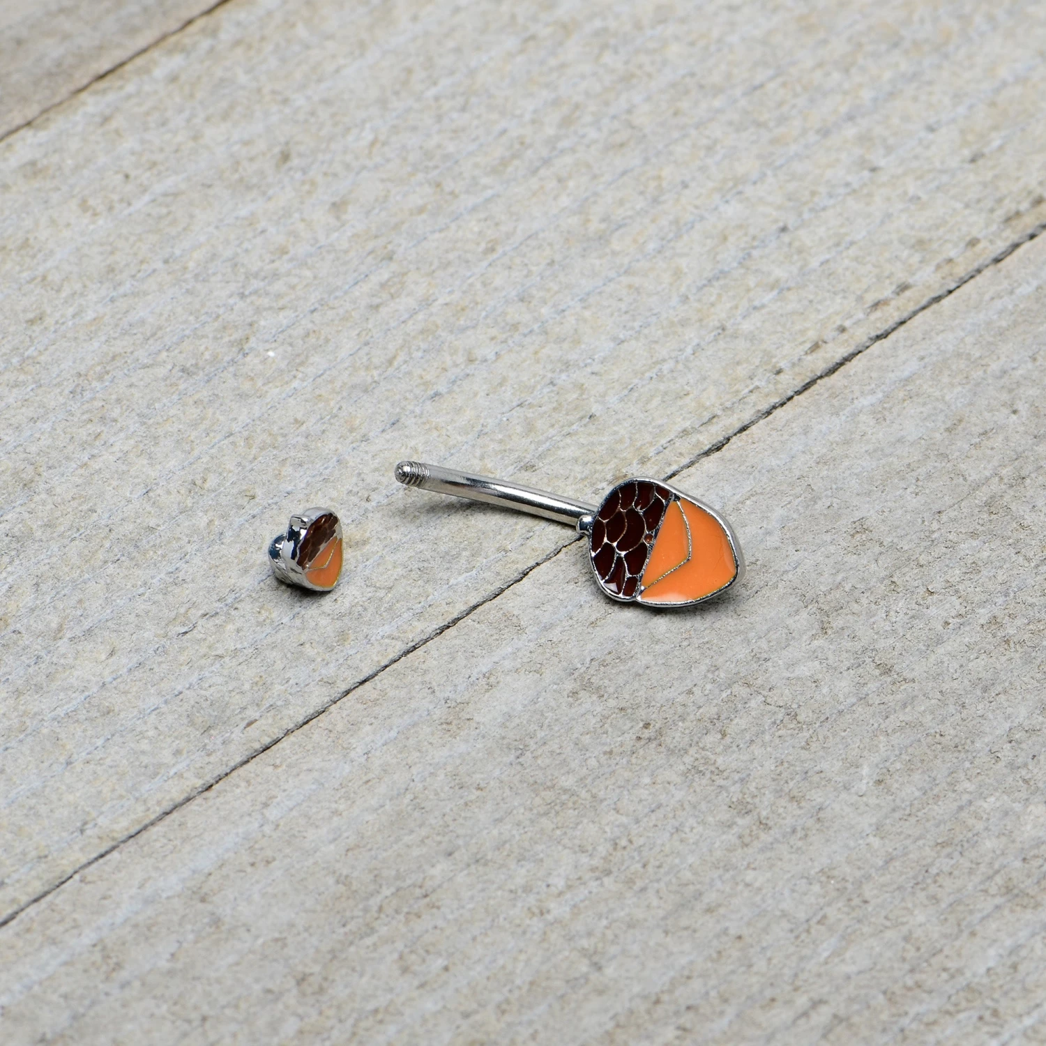 Great things grow from little seeds so show the world you’re just getting started with this 14 gauge navel ring! It’s made with a 3/8″ durable 316L surgical grade stainless steel curved barbell. Each of the ends features an acorn charm with a brown, detailed top and an orange body. Get your grow on with this wonderful woodland-themed belly piercing jewelry!