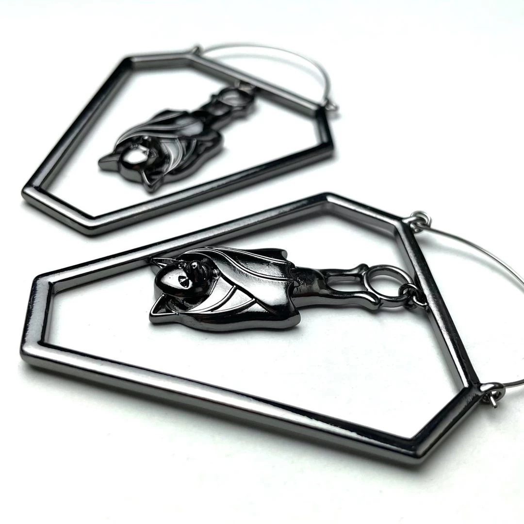 These bats love to hang around on these 20 gauge tunnel plug earrings. They’re made with 316L surgical grade stainless steel pins. They feature a large frame of a coffin, which supports an interior dangle of a bat. The bat is sleeping upside down and has its wings wrapped around its body for a creepy-but-cute appearance. At 3″ in length, these bats are sure to get you noticed! Designed to hang from tunnel plugs, they will also fit conventionally pierced lobes. Sold as a set of two