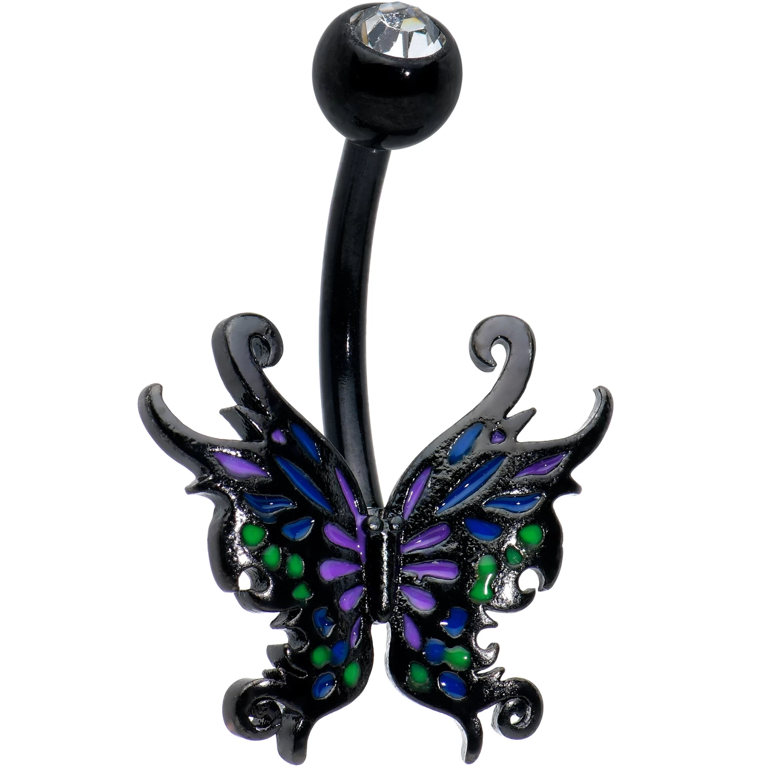 Whether you’re a Faerie at heart or a lover of dark fantasy, this 14 gauge navel ring is sure to cast a spell on you! It’s made with a 3/8″ black PVD over 316L surgical grade stainless steel curved barbell with a 5mm top ball end. The bottom end features a faerie wings charm, with blue, green, and purple embellishments to make the feather detailing really catch the eye. With its elegant style and fantasy theme, this belly piercing ring is absolutely magical!