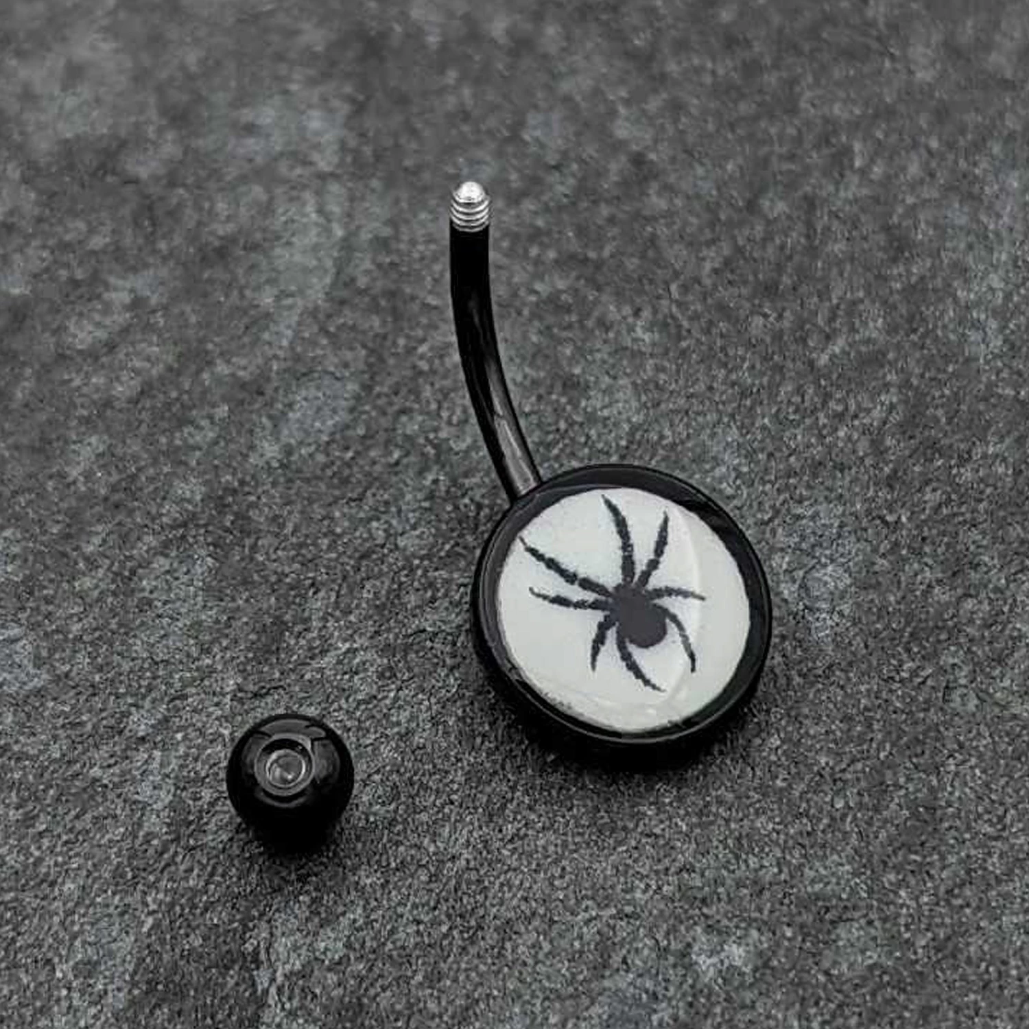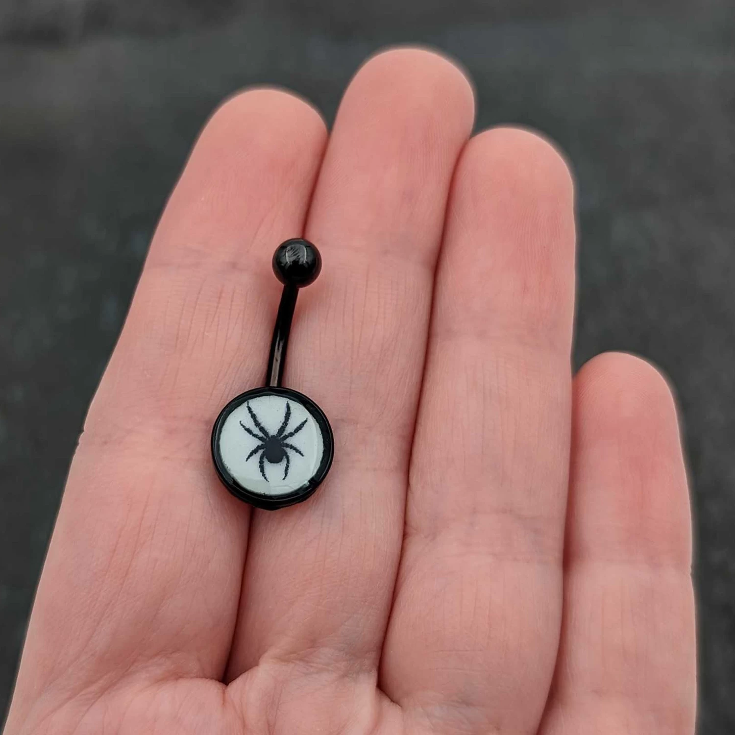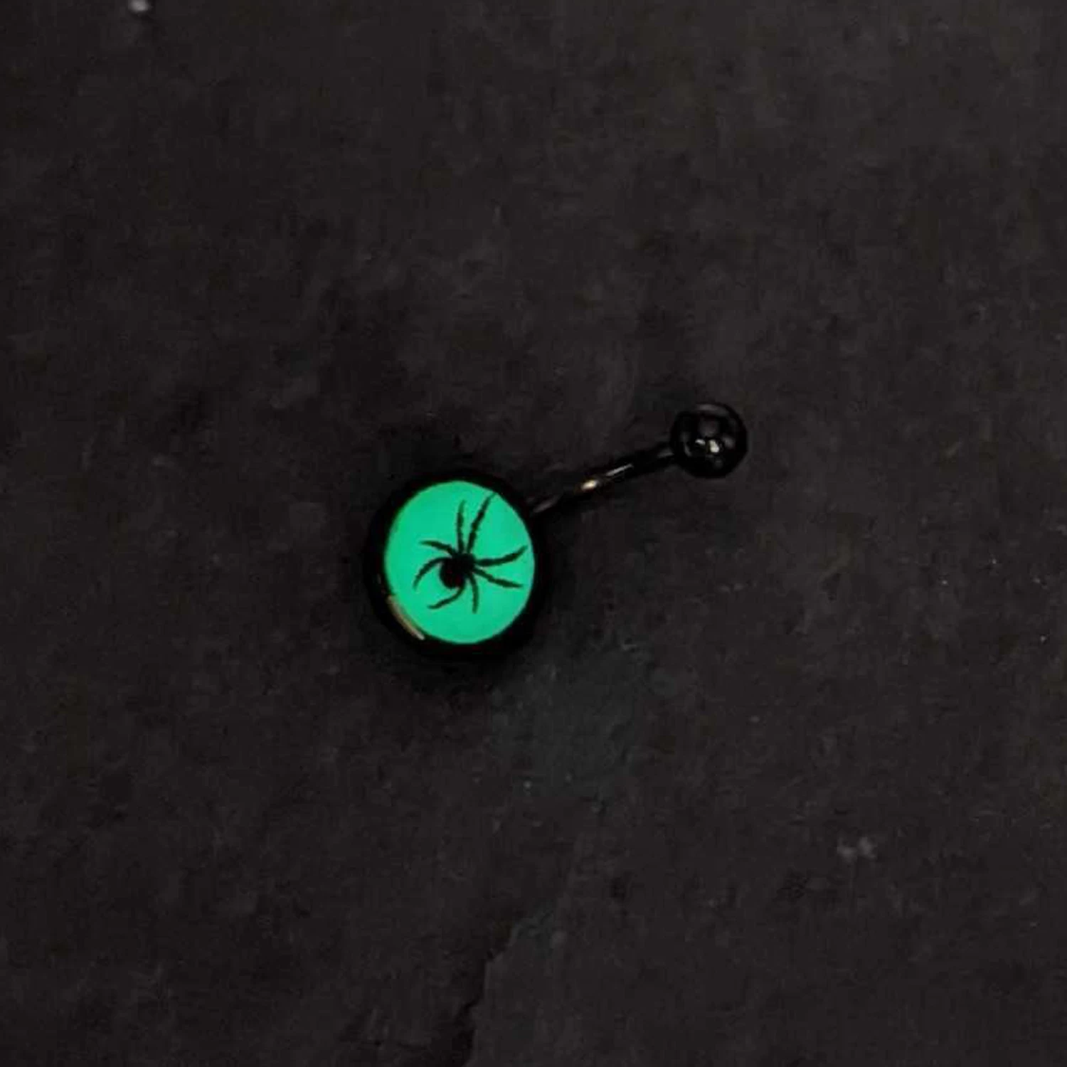 Oh what a web you weave! This black widow belly button ring is perfect for any spooky occasion like Haloween. This non dangle spider navel piercing features an anodized curved barbell and fun glow in the dark logo inlay.