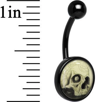 The cobweb covered cranium on this glow in the dark belly button ring seems to be wasting away in a dark and forgotten place, which will delight any Halloween lover. The artfully drawn skull highlights a navel ring fashioned from gleaming black anodized t