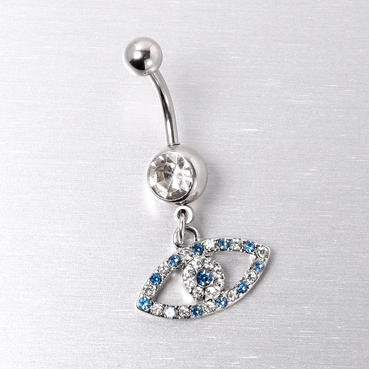 Keep your eyes open and you will spot amazing things – like this 14 gauge navel ring. It is made with a 3/8 inch durable 316L surgical grade stainless steel curved barbell with a 5mm top ball end. The bottom ball end is 8mm and set with a clear gem.Dangling beneath is an eye charm, with the rim paved in blue and clear gems. The center of the eye features more clear and blue gems for a cohesive look. You will have all eyes on you with this eye-opening belly piercing ring.