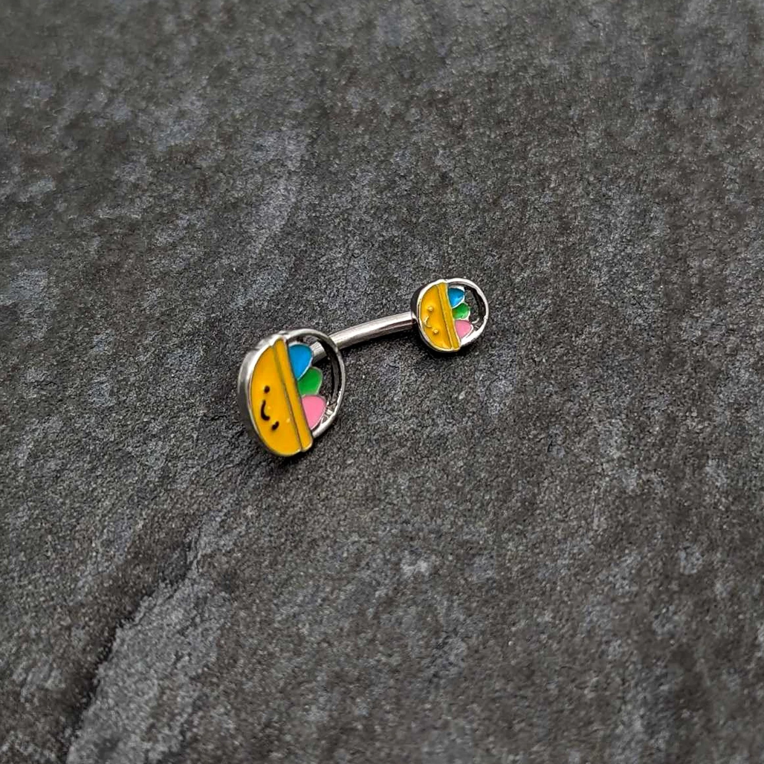 Put all your eggs in one basket with style when you’re rocking this 14 gauge navel ring! It’s made with a 3/8″ durable 316L surgical grade stainless steel curved barbell. Each of the ends features a yellow Easter basket charm, with a cheery smiling face. The baskets each contain Easter eggs in pink, green, and blue, for an added touch of festive color. You’ll be hopping down the bunny trail in kawaii style with these Easter themed belly piercing rings!