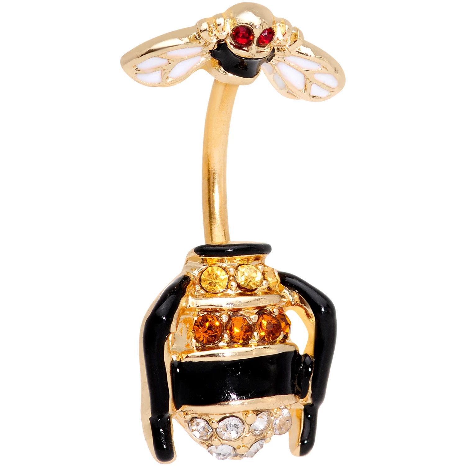 Clear Black Yellow Gem Gold Tone Bee Double Mount Belly Ring