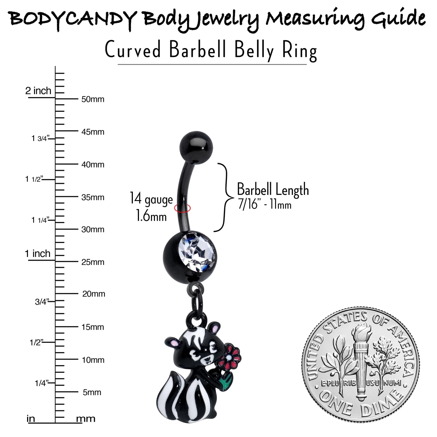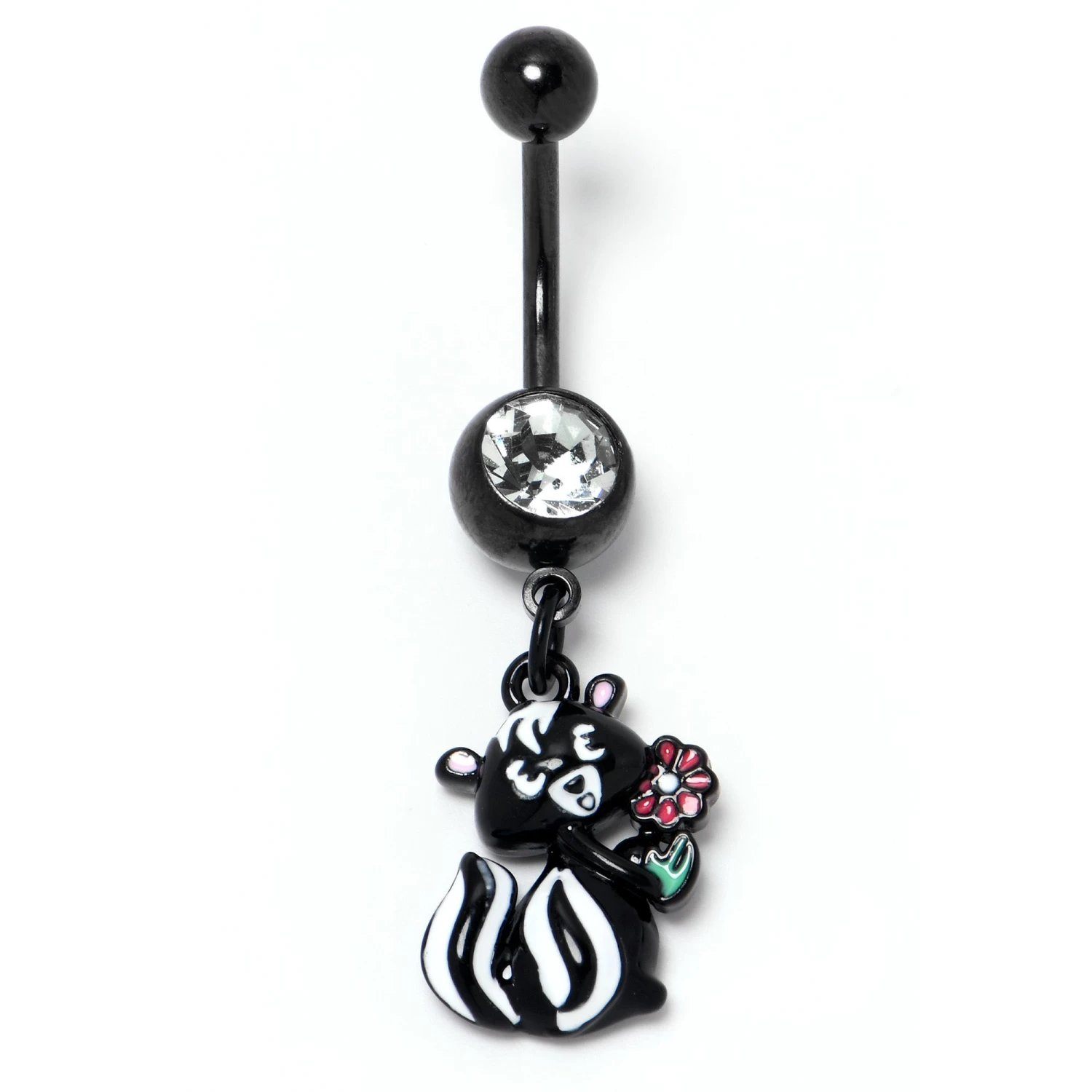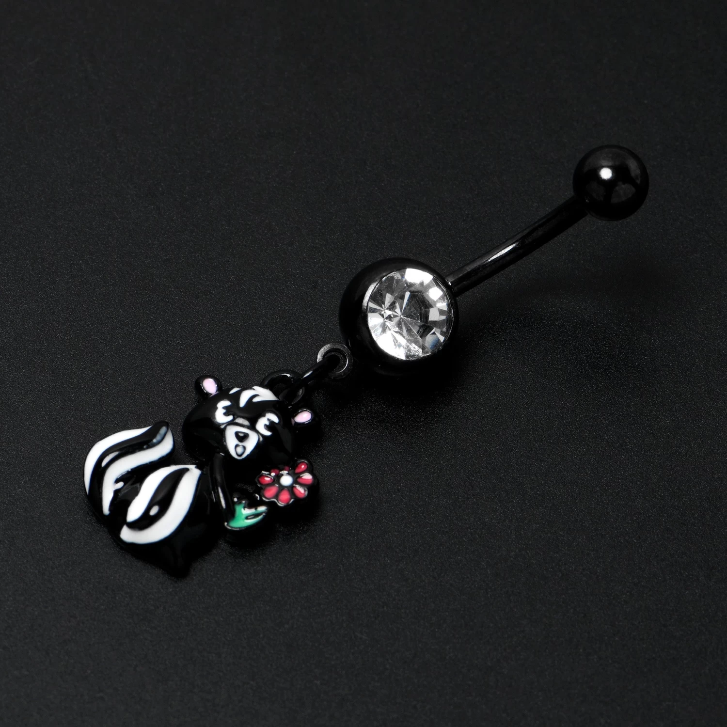 Get funky with the skunky on this 14 gauge navel ring. It is made with a 3/8 inch black PVD over 316L surgical grade stainless steel curved barbell with a 5mm top ball end. The bottom ball end is 8mm and set with a large clear gem. Dangling beneath it is an adorable skunk charm. The skunk features black and white inlay and is clutching a red inlaid flower for an extra sweet appearance. You will fall in love with the little stinker on this sweetheart skunk belly piercing ring.