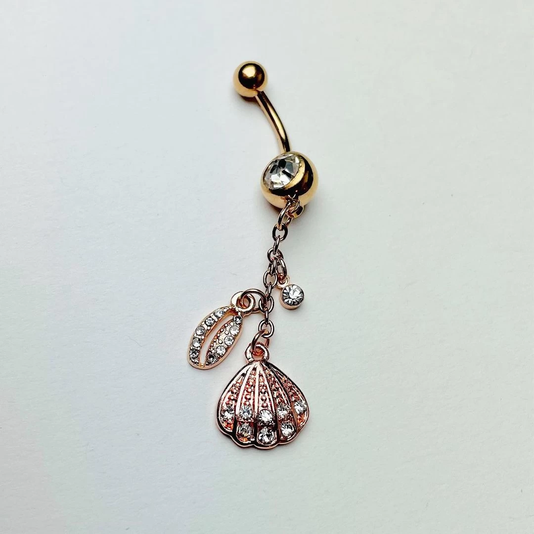 This 14 gauge navel jewelry is so elegantly structured and has such a dignified style, you’ll think you’ve stumbled across some pirate treasure! It’s made with a 3/8″ rose gold tone PVD over 316L surgical grade stainless steel curved barbell with a 5mm top ball end. The bottom ball end is 8mm and set with a large clear gem. Dangling beneath is a length a length of matching chain that supports both a single clear gem charm, paved with more clear gems. At the bottom it features a small scallop shell charm, embellished with clear gems for a cohesive look. Whether you’re a lover of the ocean or a merperson in spirit, this stunning shell belly button ring is sure to please.