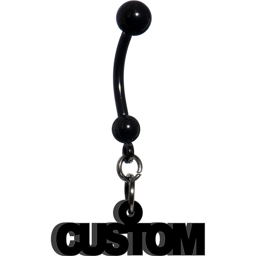 Take your gift-giving to the next level when you personalize this stunning custom dangle belly ring. This customizable belly ring is made with a 14 gauge black anodized titanium over surgical grade stainless steel curved barbell and features an acrylic dangle charm that can fit your personal message up to 8 characters in length. Custom navel jewelry is a unique gift idea that preserves the name or short message that is special to you or someone you love.