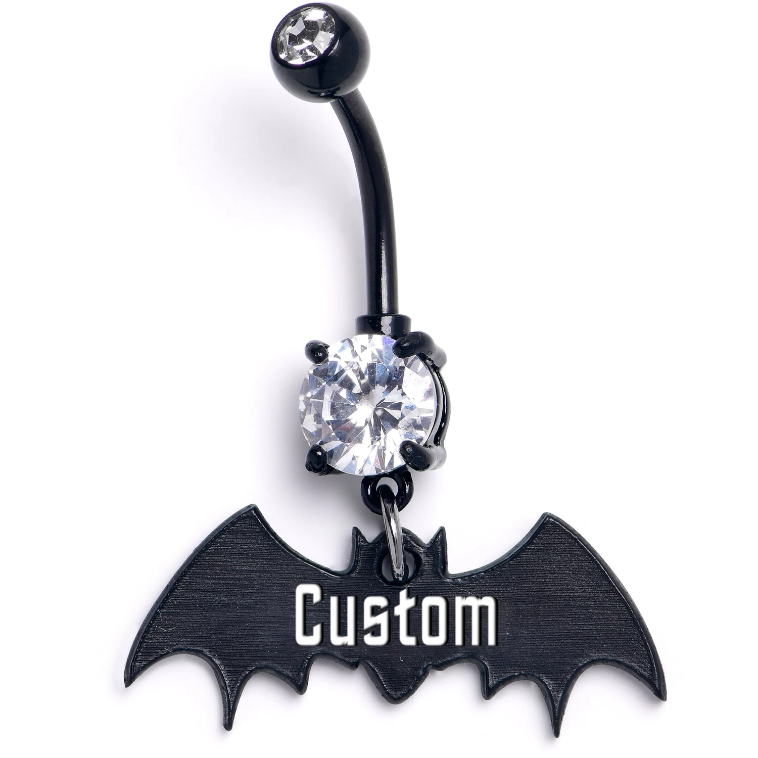 For style that is not just fly by night, check out this 14 gauge navel ring.It features a dangle charm of a black bat, with understated wing detailing, and customizable body. Custom dangle belly button jewelry. This customizable navel ring is made with a 7/16 inch black anodized titanium over 316L surgical grade stainless steel curved barbell. The 5mm top ball end is set with a clear gem and the bottom end is a matching clear gem. Dangling beneath is a bat shaped black and white dangle charm that can be customized up to 6 characters in length to make a belly ring all your own. This personalized navel jewelry is the perfect gift for someone special to you.