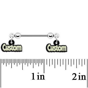 Get creative with your gift giving when you personalize this custom dangle nipple barbell set. This customizable nipple ring set is made with 14 gauge surgical grade stainless steel straight barbell that measures 16mm in length, features glow in the dark charms that can fit your name or personal message up to 7 characters hung from each ball end, and is sold as a set of two for you. Simply click and enter the name or short message that means the most to you with this custom nipple jewelry that is a unique gift idea for someone special. The same message will dangle from each ball end.