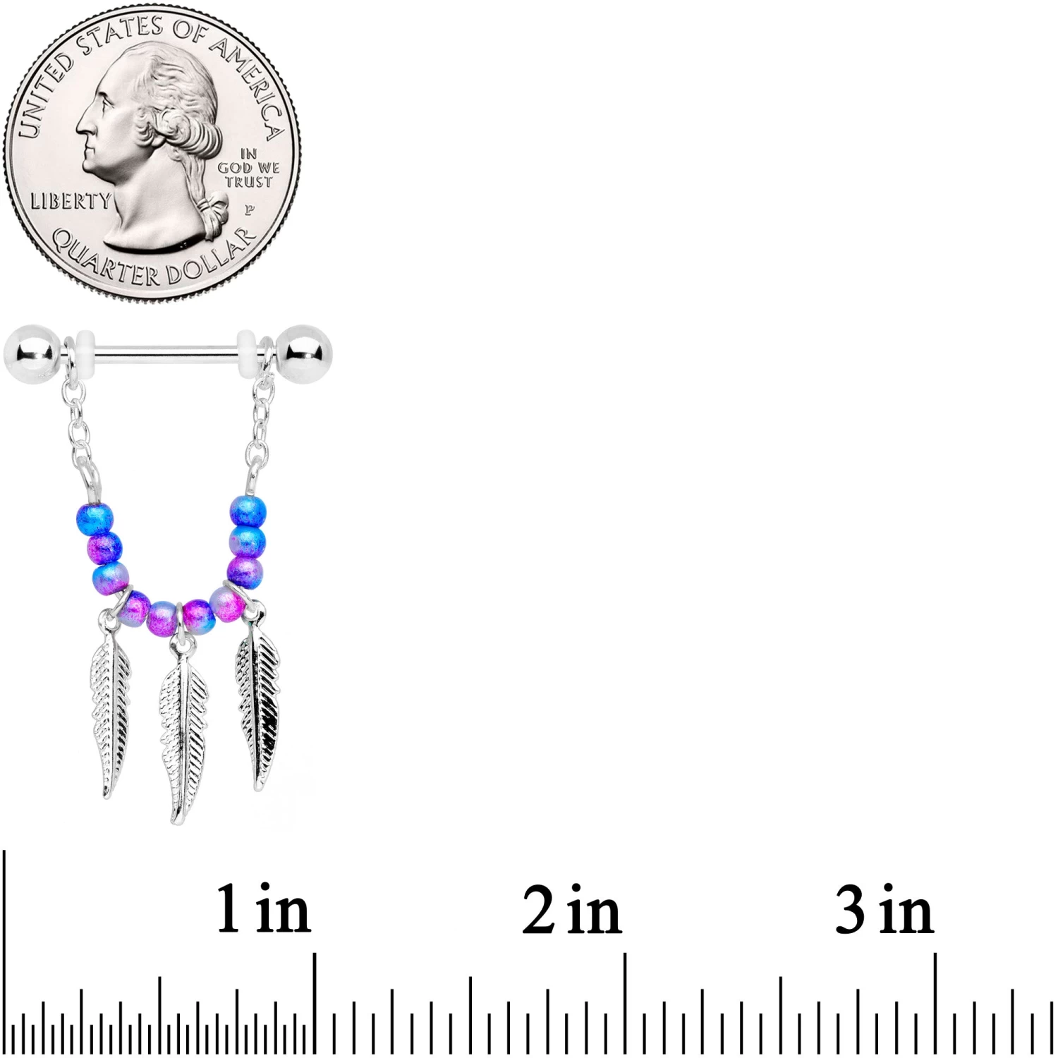 Whether your heart beats for birds or feathers make it flutter, this Southwestern styled nipple jewelry will make your nipple piercings take wing! They’re made with 12mm durable 316L surgical grade stainless steel straight barbells with 5mm ball ends. Each one features a dangling strand of ombre blue and purple beads with a pearlescent finish. Hanging from each beaded strand is a trio of feather charms. You can adjust the dangling portion along the barbell so you get just the look you’re after! Let your nipple piercings spread their wings and fly in colorful style with these striking dangle nipple rings! Sold as a set of two.