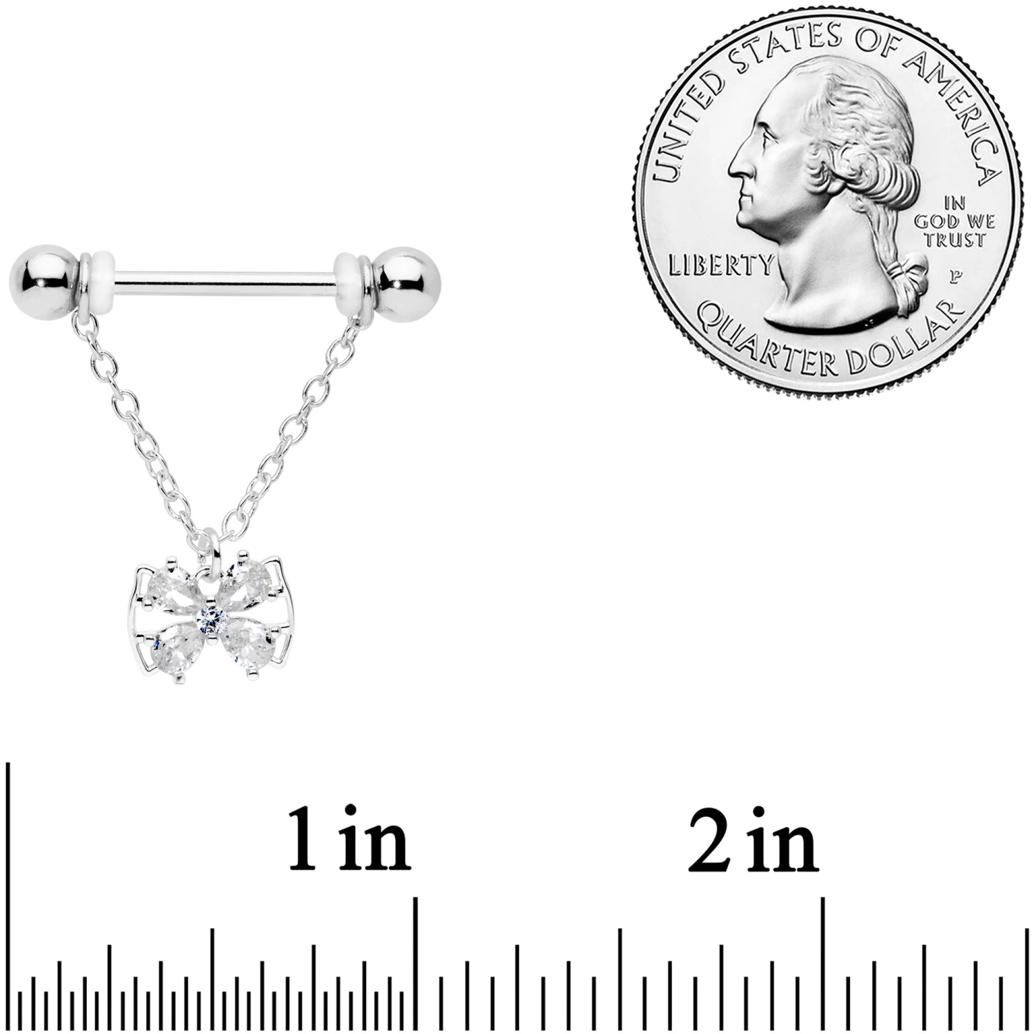 14 Gauge 11/16 Clear CZ Gem Beauty Bow Chain Dangle Nipple Ring Set