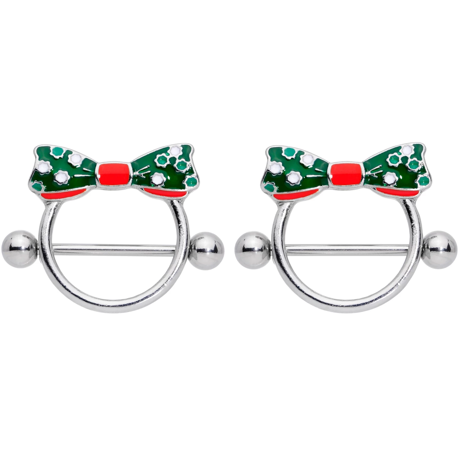 Wrap those piercings with a bow when you’re wearing this 14 gauge nipple jewelry! It’s made with a 17mm wearable length 316L surgical grade stainless steel straight barbells with 5mm ball ends. The shield portions have a 14mm rise. They feature green bows on the top, with white polka dots. They further embellished with red inlaid centers and red detailing along the bottom side of the bows. Turn your nipple piercings into presents with these holiday bow-themed nipple shields! Sold as a set of two.