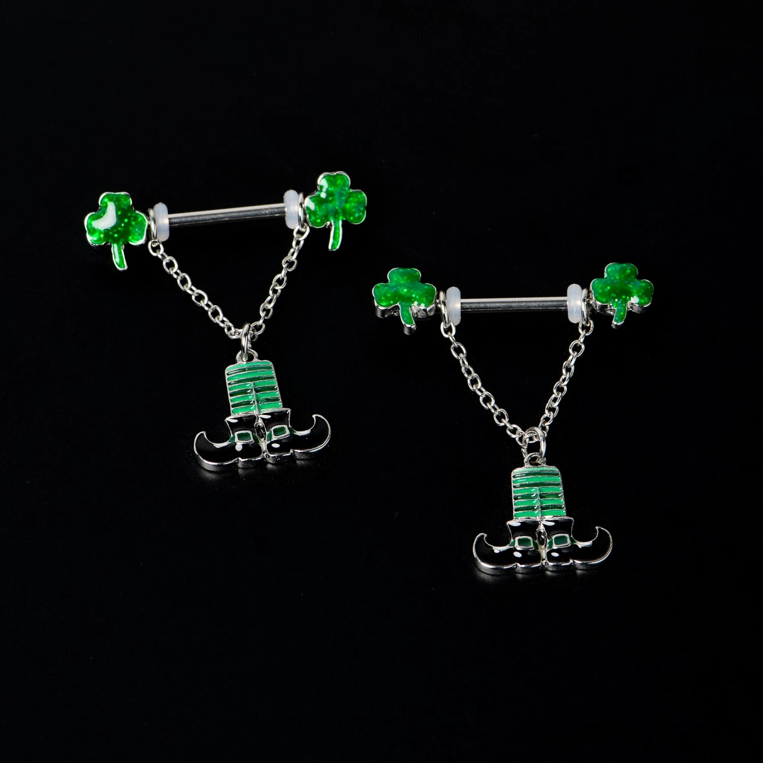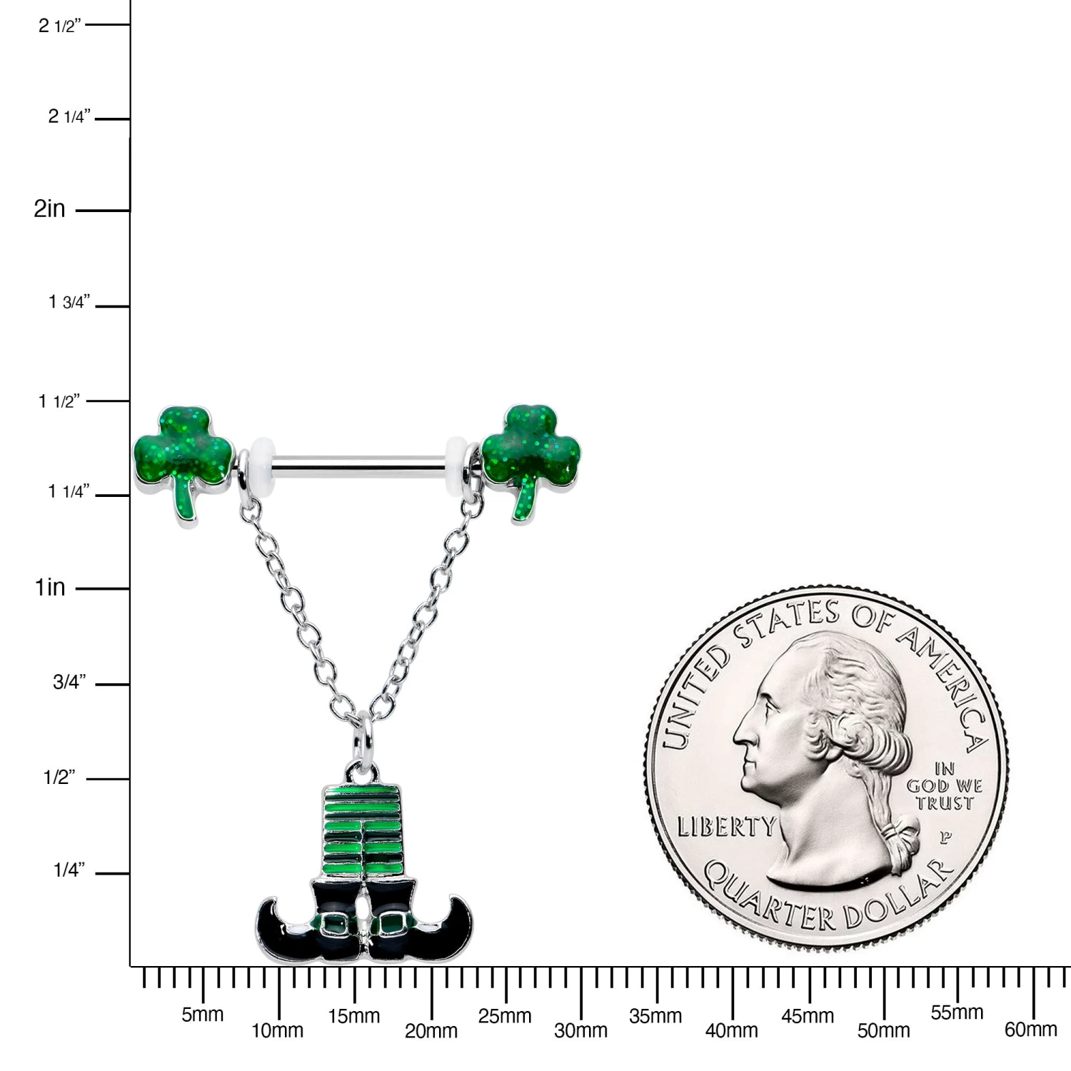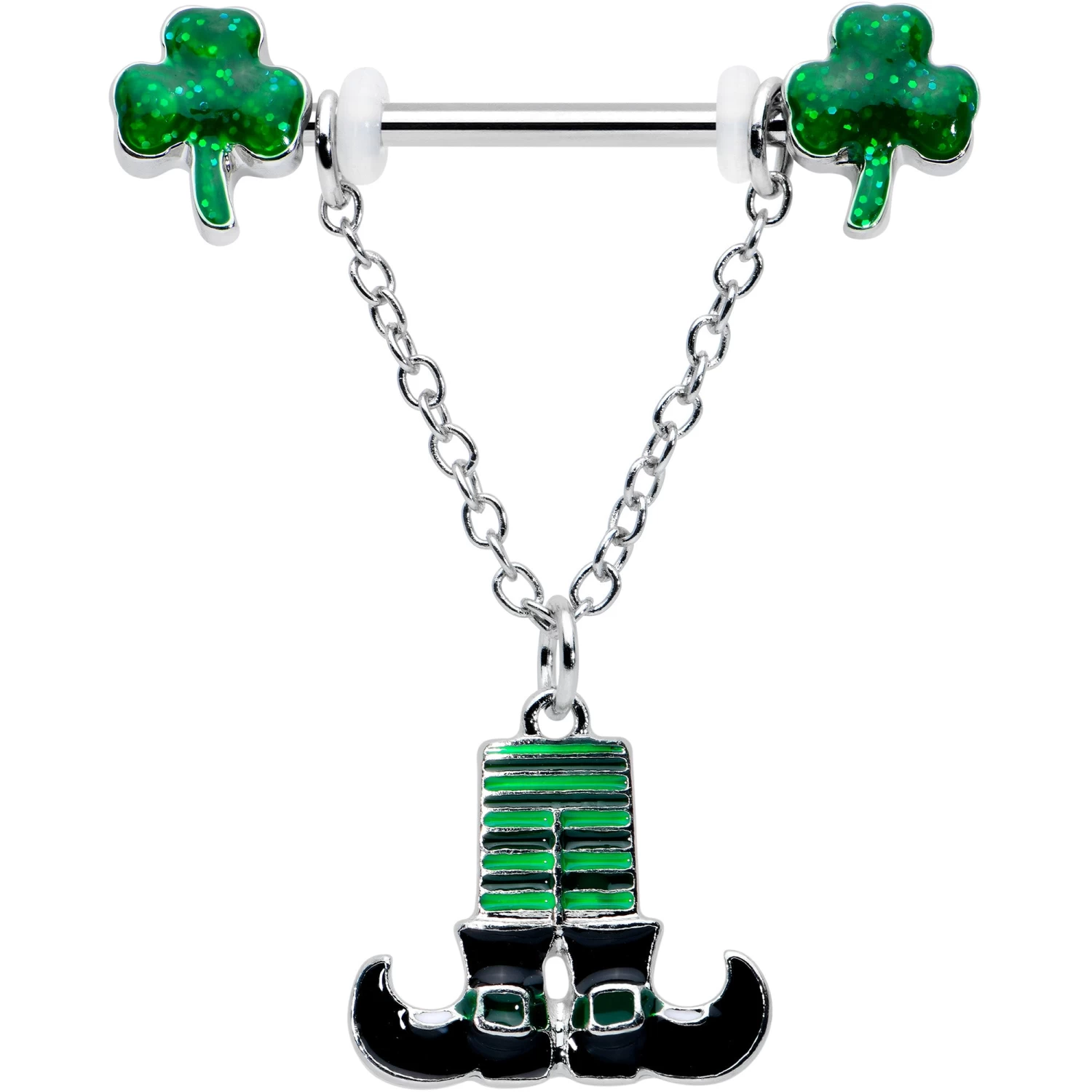 14 Gauge 11/16 Leprechaun Legs Shamrock Chain Dangle Nipple Ring Set