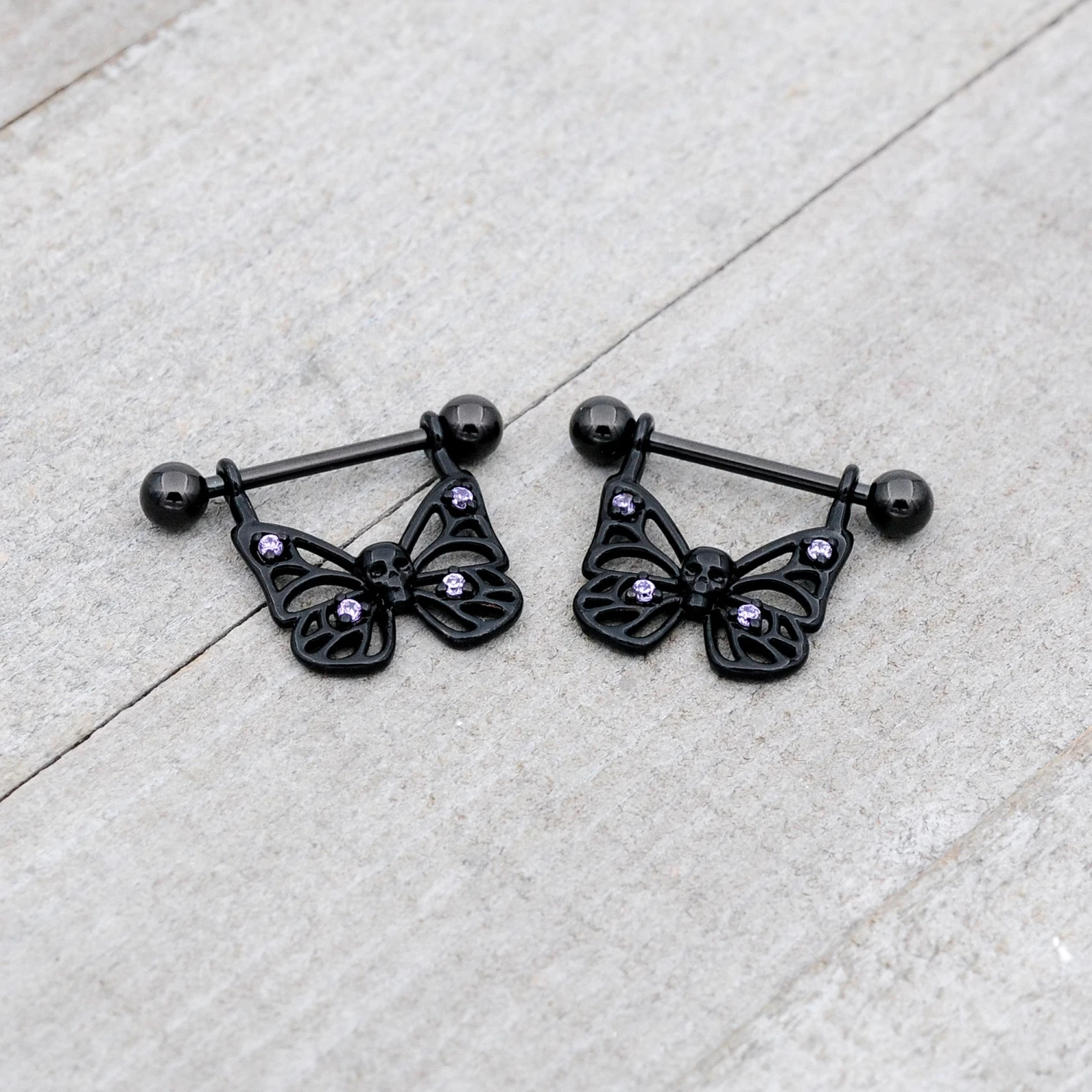 14 Gauge 11/16 Purple CZ Gem Black Skull Butterfly Dangle Nipple Ring Set