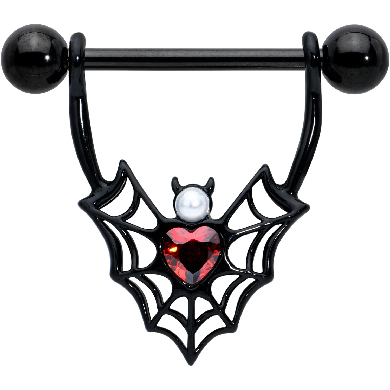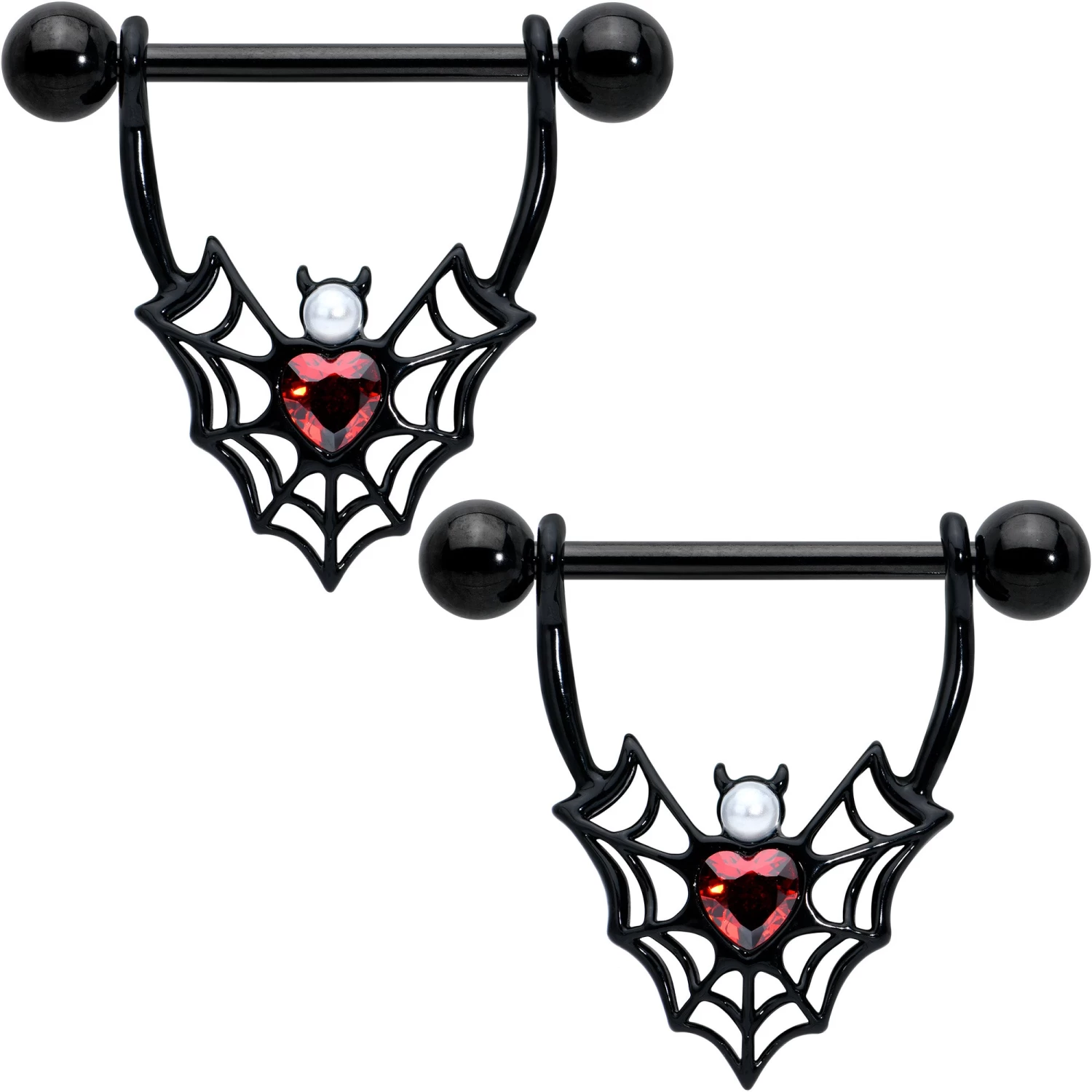 Show your appreciation for those beautiful bats with this 14 gauge nipple jewelry. It is made with 18mm black PVD over 316L surgical grade stainless steel straight barbells with 5mm ball ends. The shield portions each feature a heart charm, composed of a spider web pattern. The hearts serve as wings for bat embellishments, with pearlescent white orb heads and red gem, heart shaped bodies. Show your fondness for all the creepy, crawly, flying friends of the night with these gorgeous and gothic nipple piercing rings. Sold as a set of two.