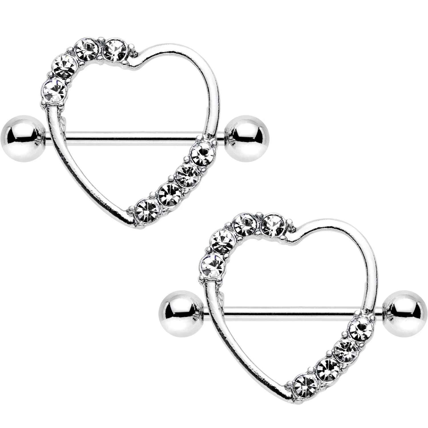 Dress up your breasts with the essence of love and beauty when you wear this pretty pair of 14 gauge nipple piercings. Made with 19mm durable 316L surgical grade stainless steel straight barbells, this set of nipple shields features heart shield charms with a 14mm diameter opening lined with clear gems. This pair of Valentine’s Day inspired nipple barbells is sold as a set of two for you!